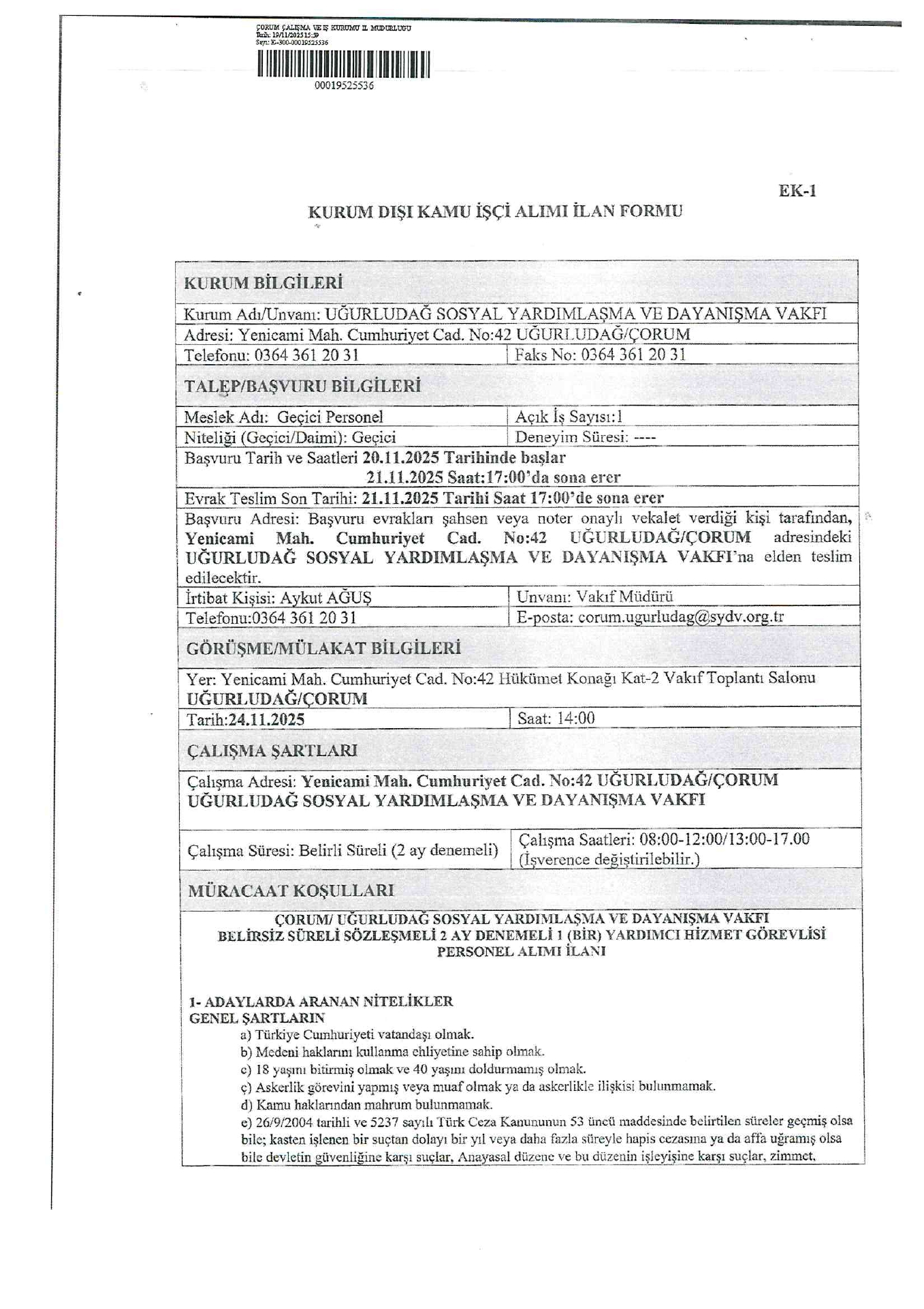 Ana sayfaSYDV İlanlarıAna sayfaGeçici İşçi İlanları Çorum Uğurludağ SYDV Geçici 1 İşçi Alacak Çorum Uğurludağ SYDV Geçici 1 İşçi Alacak. Son başvuru tarihi 21 Kasım 2025 Kaynak : İşkur İlan Giriş : 19 Kasım 2025 23:33, Son Güncelleme : 19 Kasım 2025 23:37 Yazdır Yorumlar (0) Abone Ol