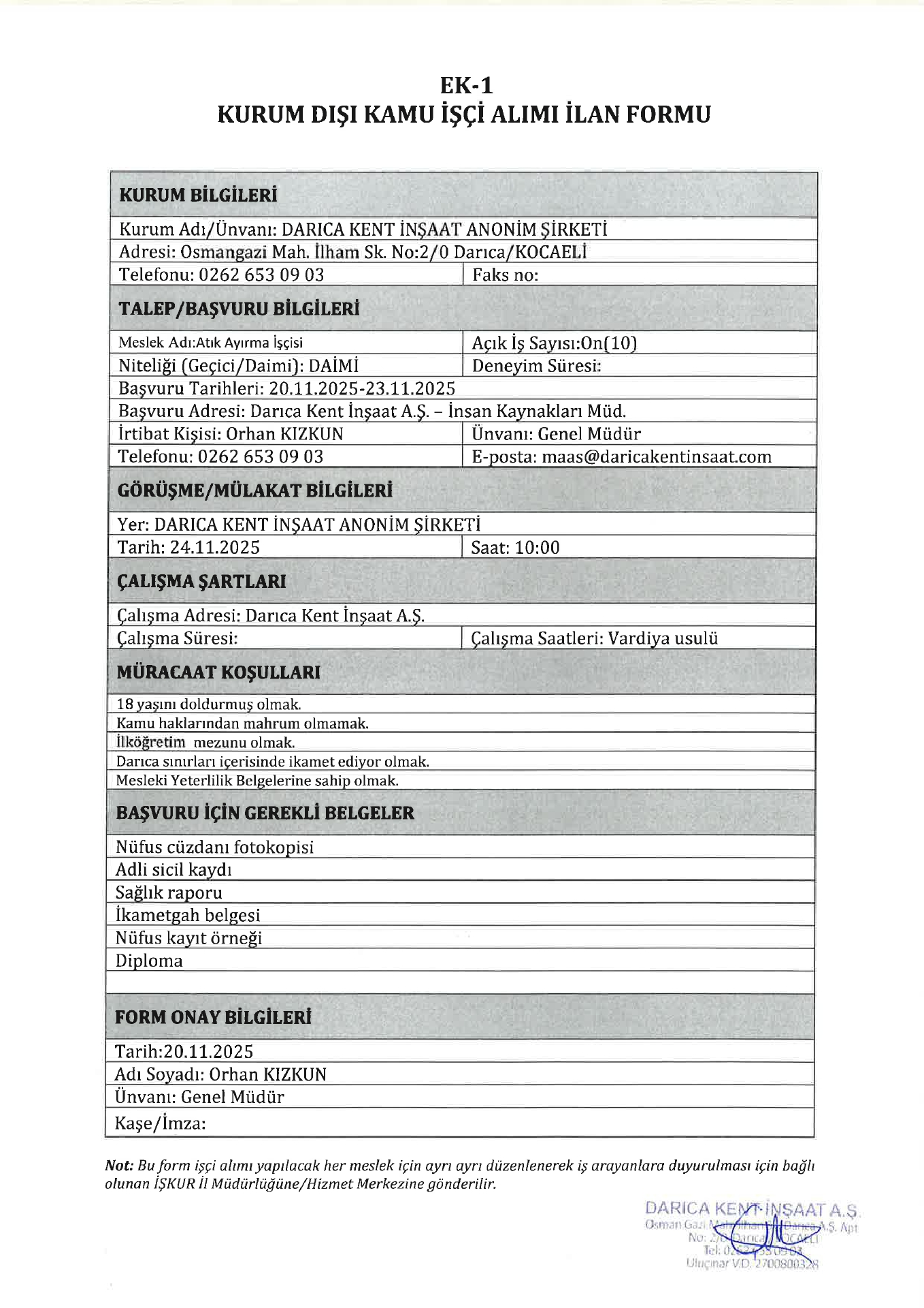 Ana sayfaDaimi İşçi İlanları Kocaeli Darıca Kent İnşaat 10 İşçi Alacak Kocaeli Darıca Kent İnşaat 10 İşçi Alacak. Son başvuru tarihi 23 Kasım 2025 Kaynak : İşkur İlan Giriş : 20 Kasım 2025 22:59, Son Güncelleme : 20 Kasım 2025 23:48 Yazdır Yorumlar (0) Abone Ol
