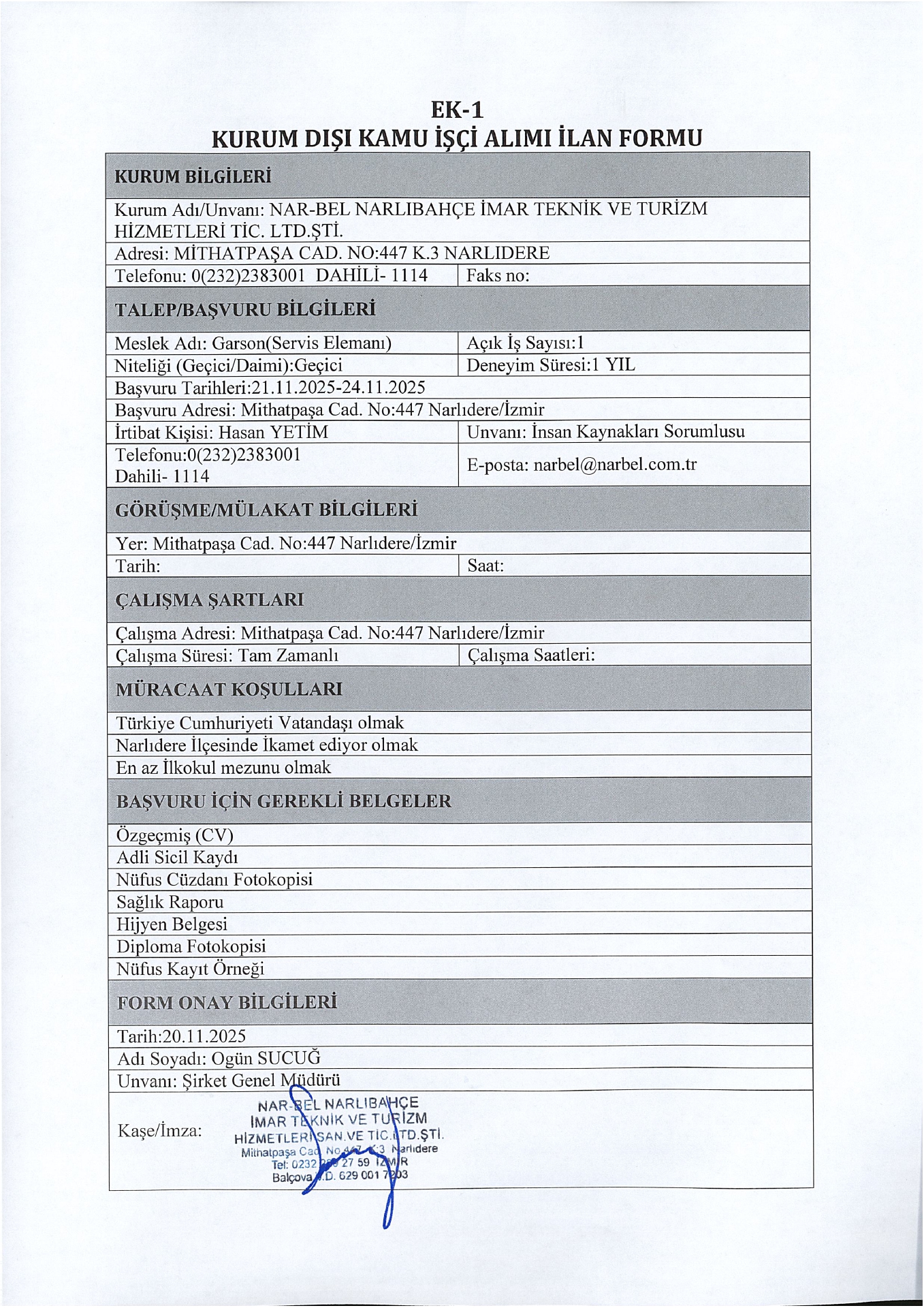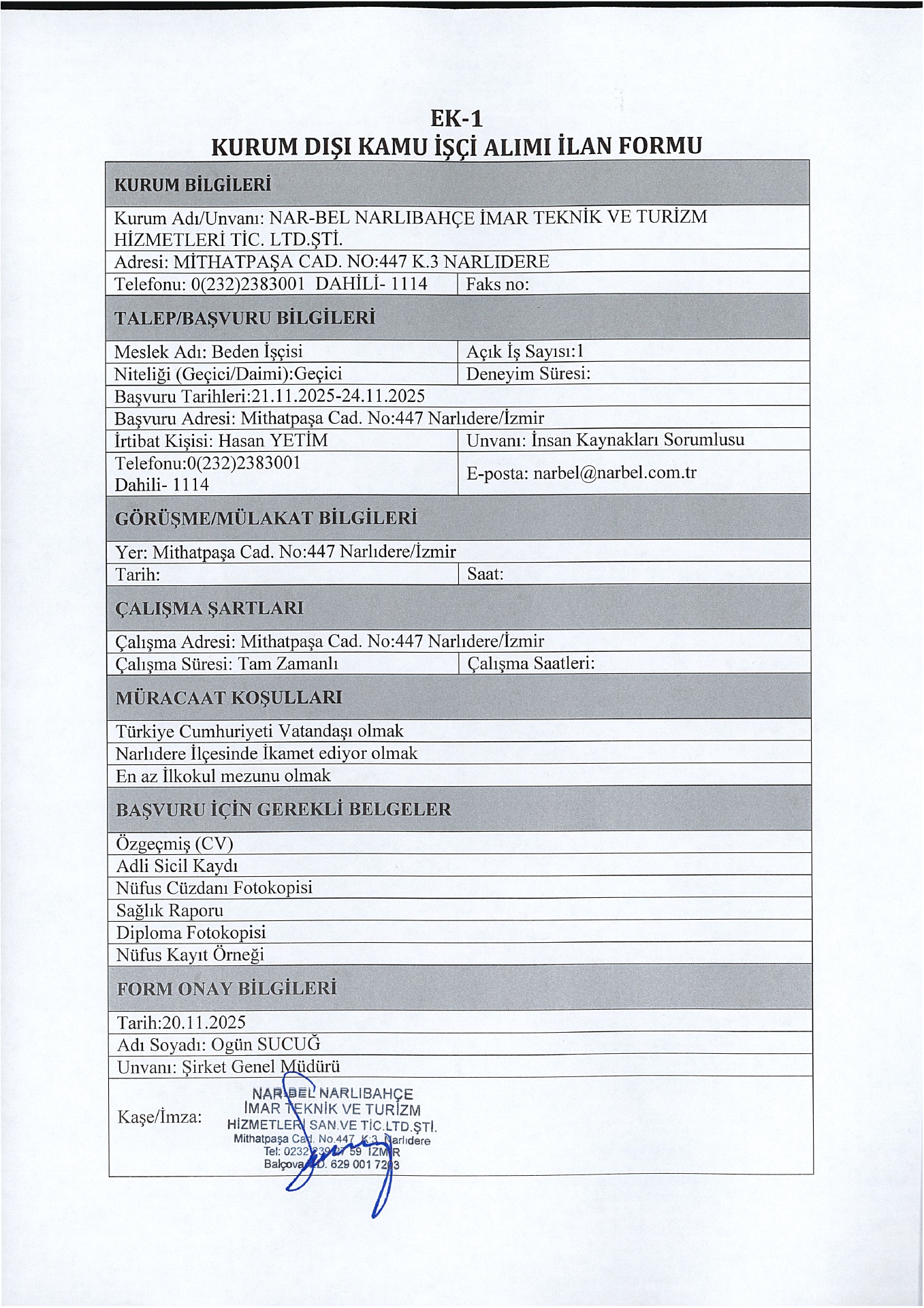 Ana sayfaGeçici İşçi İlanları İzmir Nar-Bel Geçici 2 İşçi Alacak İzmir Nar-Bel Geçici 2 İşçi Alacak. Son başvuru tarihi 24 Kasım 2025 Kaynak : İşkur İlan Giriş : 20 Kasım 2025 23:09, Son Güncelleme : 20 Kasım 2025 23:46 Yazdır Yorumlar (0) Abone Ol