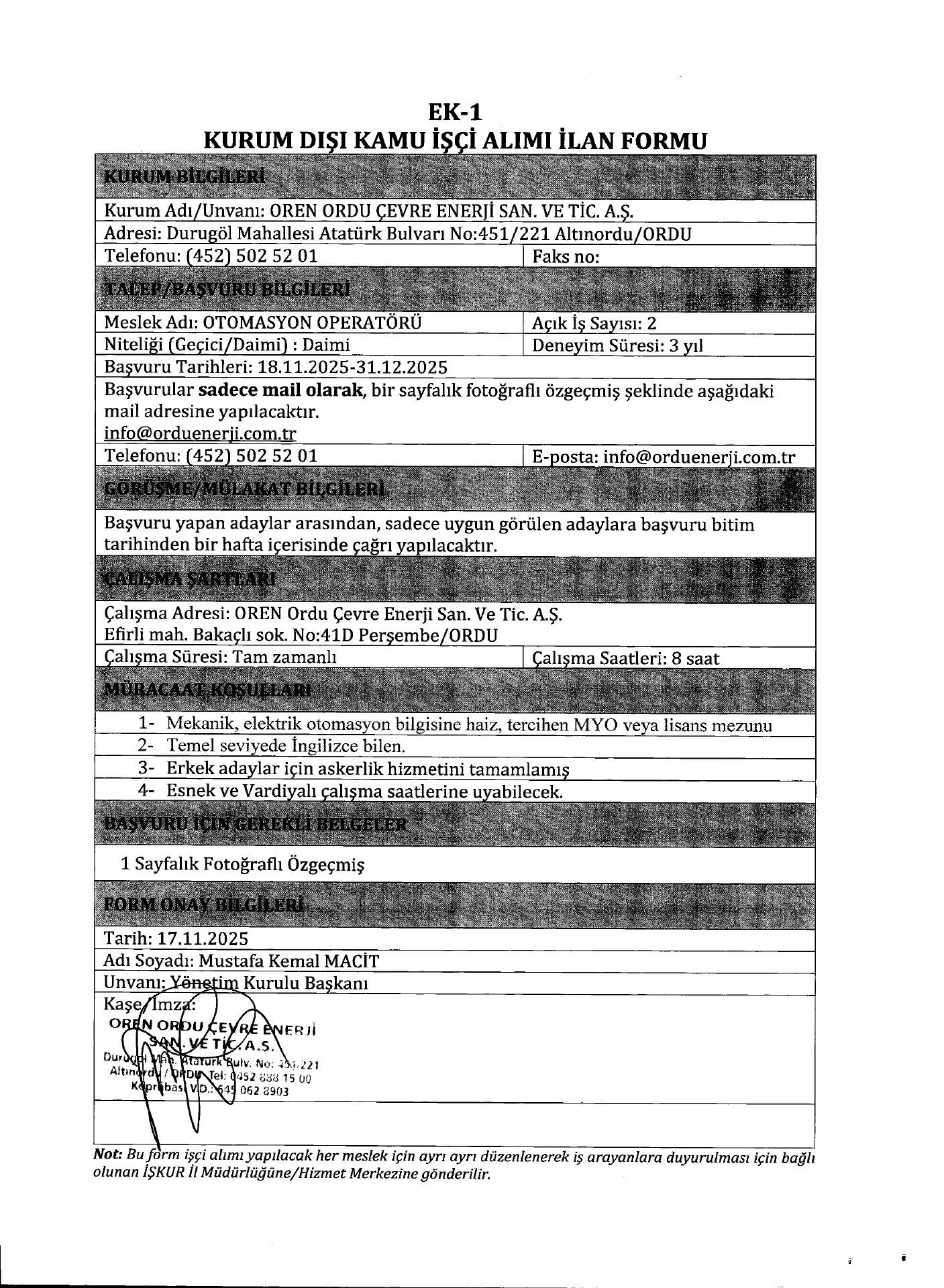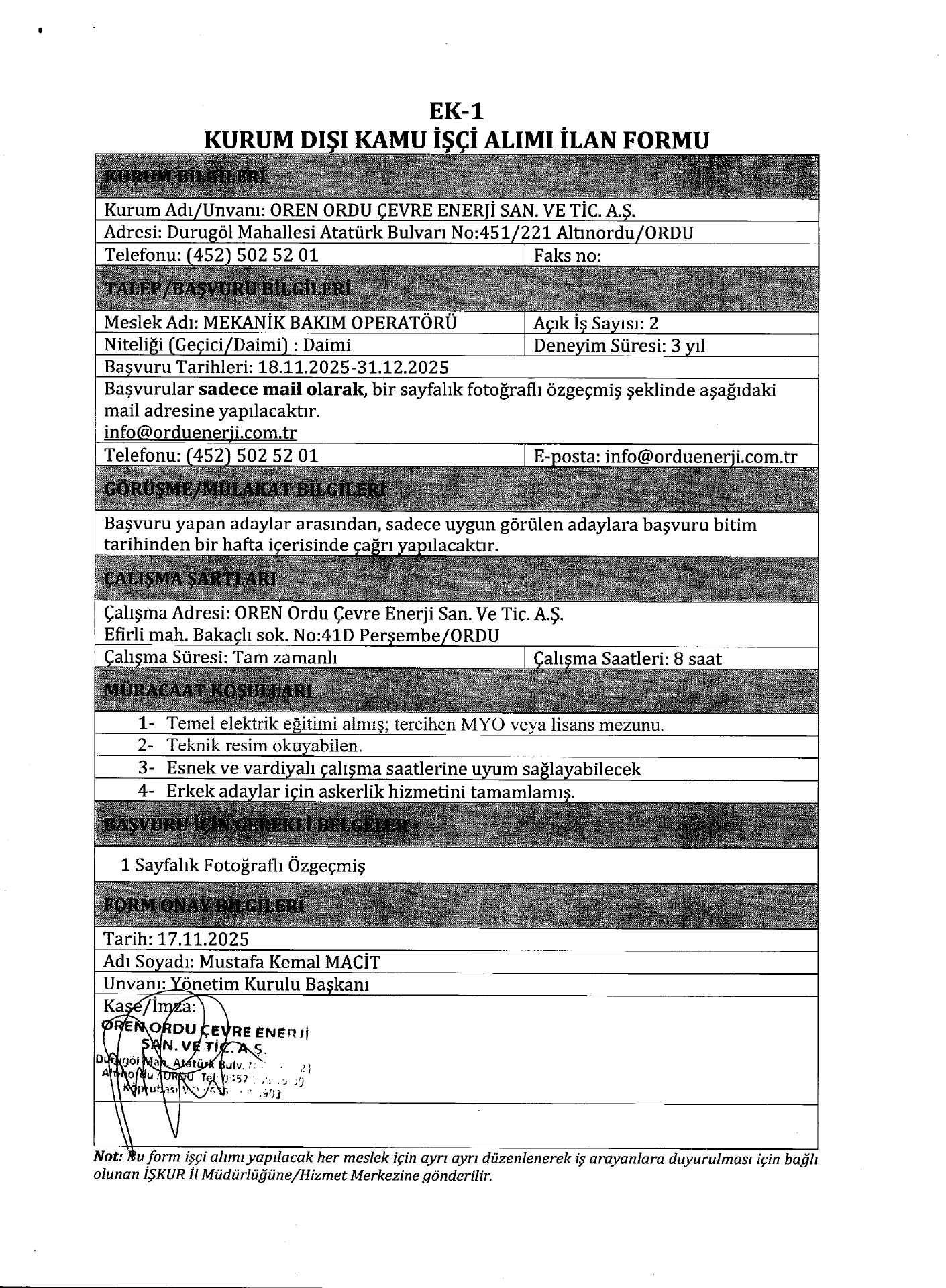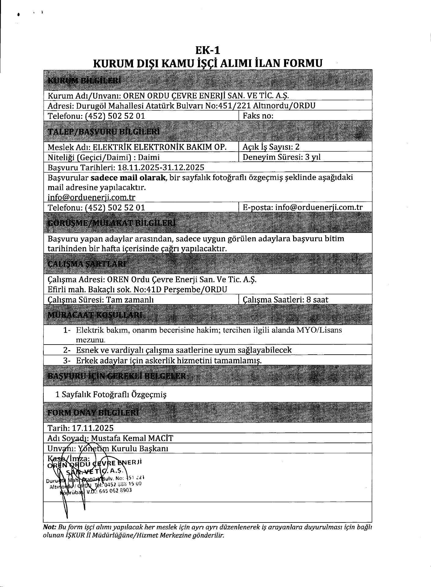 Ordu Ören Çevre Enerji 6 İşçi Alacak. Son başvuru tarihi 31 Aralık 2025