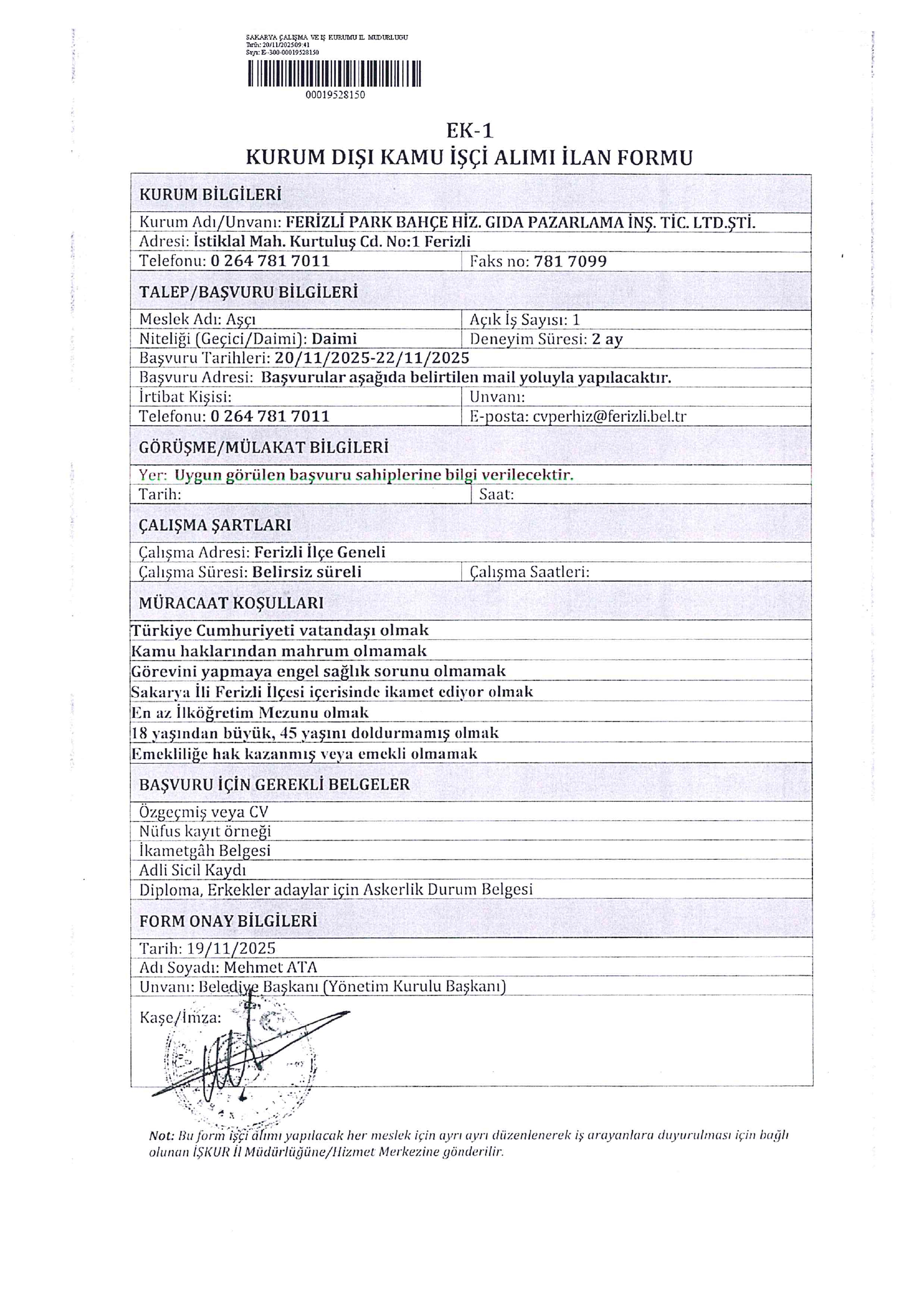 Ana sayfaDaimi İşçi İlanları Ferizli Park Bahçe Hizmetleri 1 İşçi Alacak Ferizli Park Bahçe Hizmetleri 1 İşçi Alacak. Son başvuru tarihi 22 Kasım 2025 Kaynak : İşkur İlan Giriş : 20 Kasım 2025 23:19, Son Güncelleme : 20 Kasım 2025 23:43 Yazdır Yorumlar (0) Abone Ol