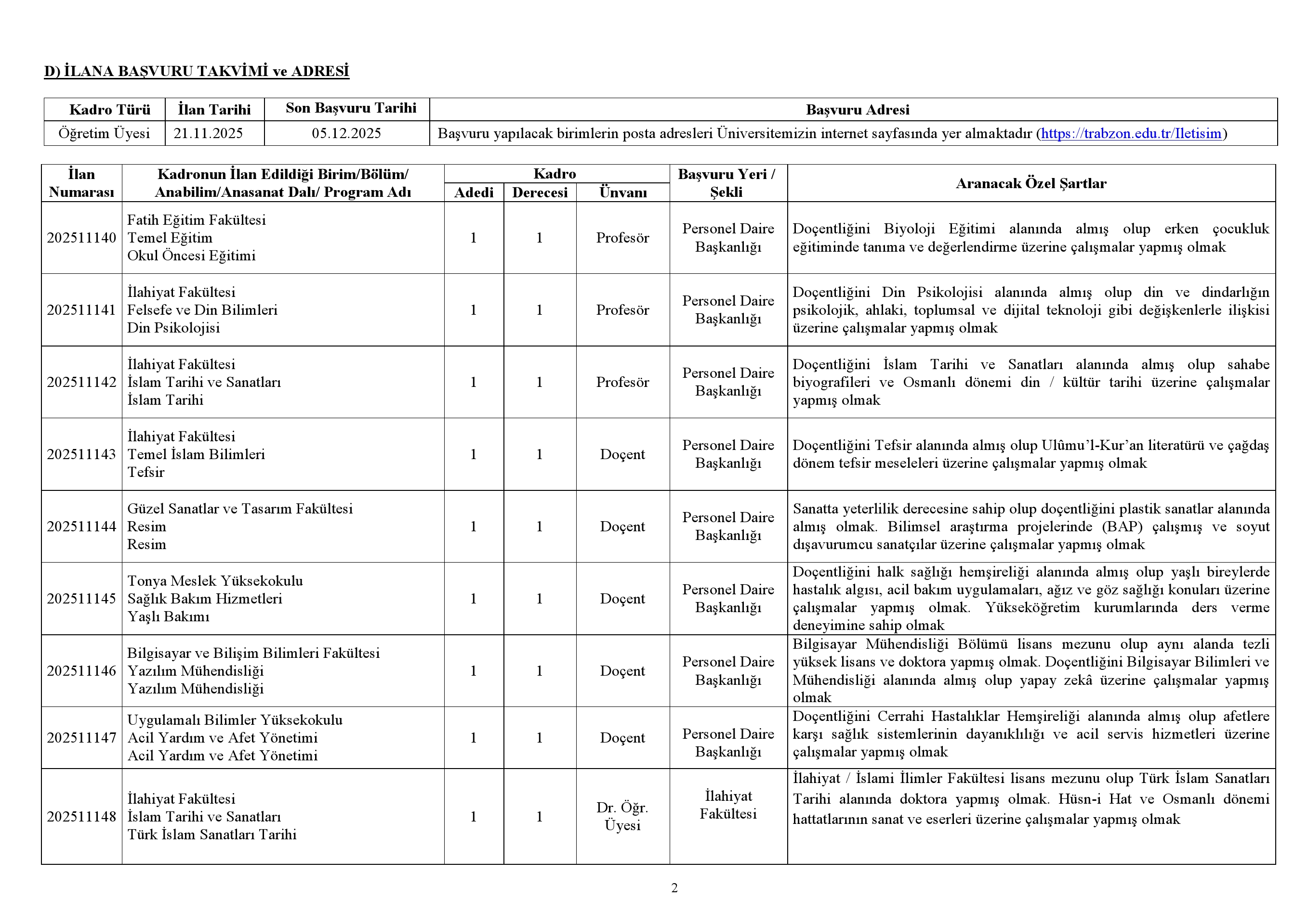 Trabzon Üniversitesi Öğretim Üyesi Alım İlanı. Son başvuru tarihi 5 Aralık 2025
