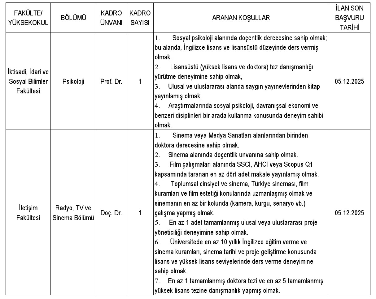 Kadir Has Üniversitesi Öğretim Üyesi Alım İlanı. Son başvuru tarihi 5 Aralık 2025