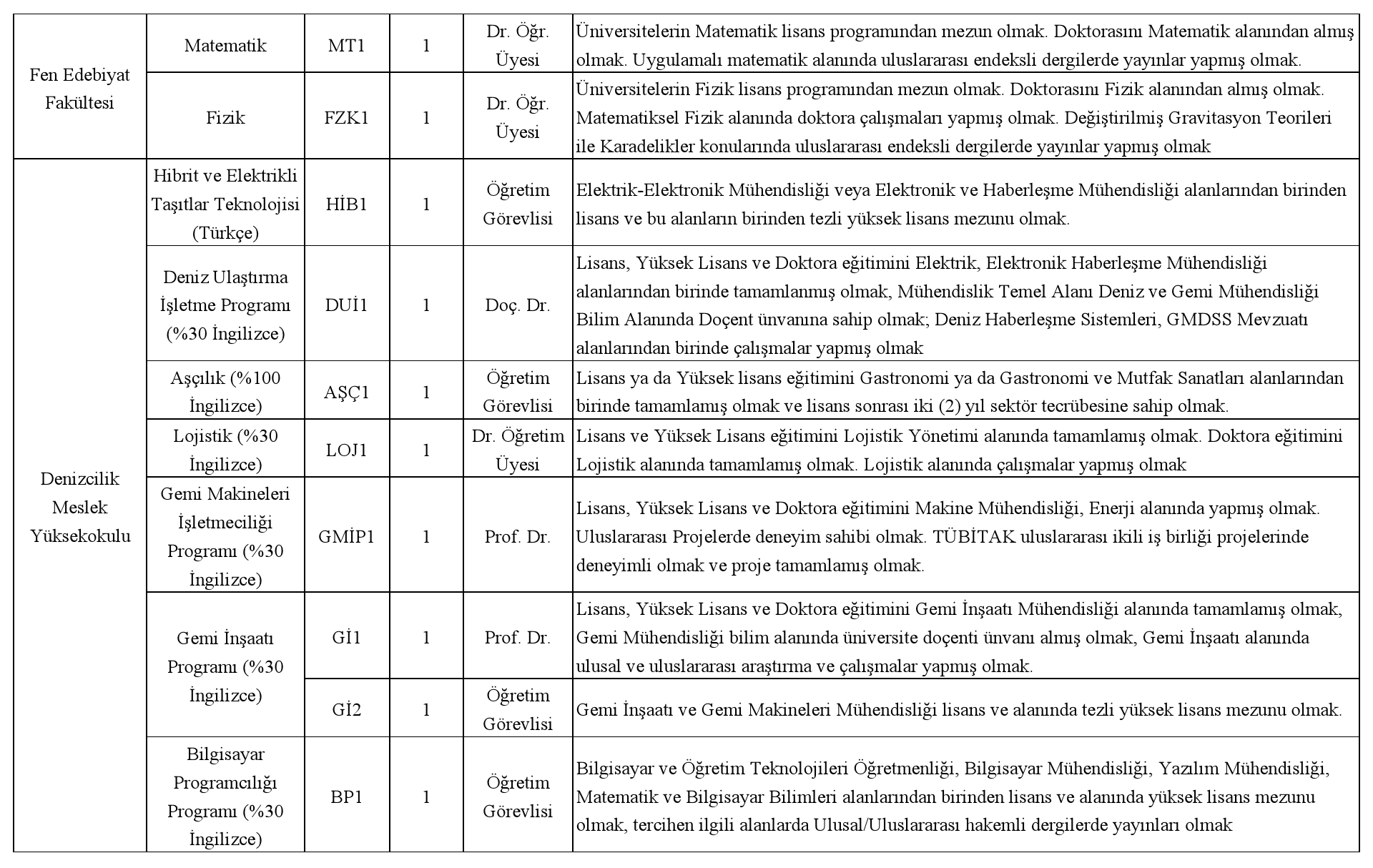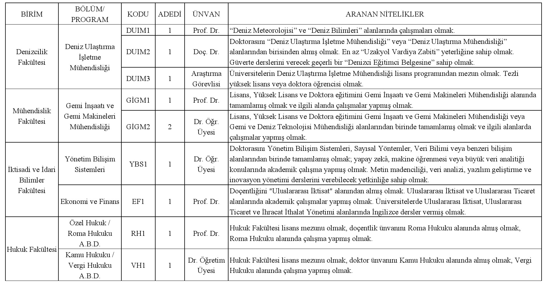 Üniversitemizin aşağıda belirtilen birimlerine 2547 sayılı Yükseköğretim Kanununun ilgili maddeleri ile "Öğretim Üyeliğine Yükseltilme ve Atanma Yönetmeliği", "Öğretim Üyesi Dışındaki Öğretim Elemanı Kadrolarına Yapılacak Atamalarda Uygulanacak Merkezi Sınav ile Giriş Sınavlarına İlişkin Usul ve Esaslar Hakkında Yönetmelik" ve "Piri Reis Üniversitesi Öğretim Üyeliğine Yükseltilme ve Atama Ölçütlerine İlişkin Senato Esaslarının ilgili hükümleri uyarınca Öğretim Elemanları alınacaktır.