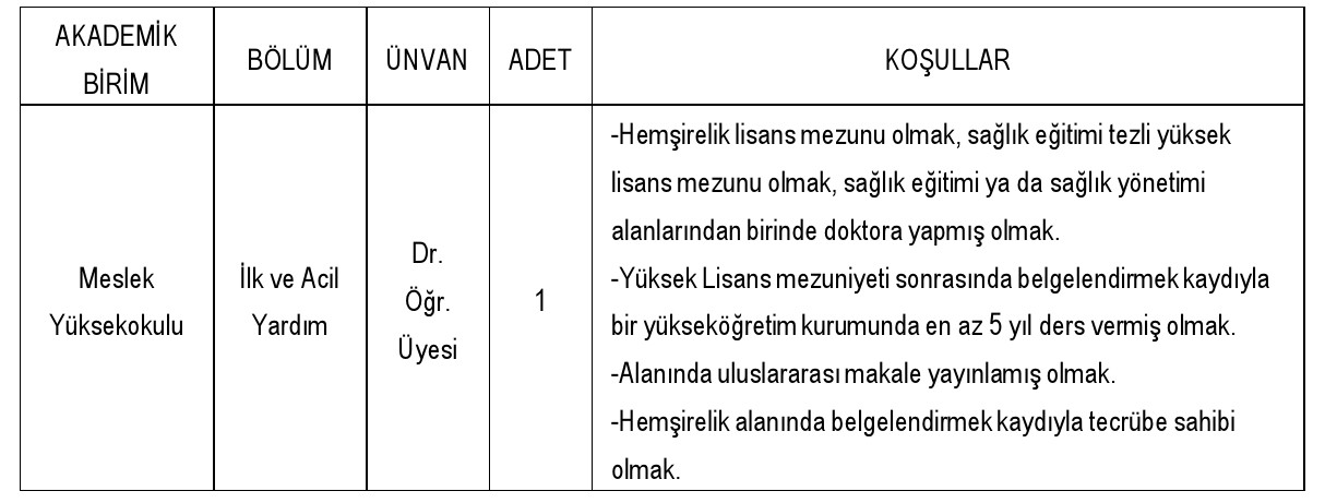 Üniversitemizin aşağıda belirtilen akademik birimine, 2547 sayılı Yükseköğretim Kanunu'nu, "Öğretim Üyeliğine Yükseltilme ve Atanma Yönetmeliği" ile Üniversitemiz "Öğretim Üyeliğine Yükseltilme ve Atanma Yönergesi" nin ilgili maddeleri uyarınca Doktor Öğretim Üyesi alınacaktır.