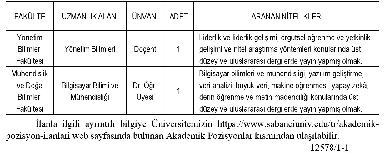 2547 sayılı Yükseköğretim Kanunu ve Öğretim Üyeliğine Yükseltilme ve Atanma Yönetmeliği doğrultusunda, Üniversitemize tam zamanlı öğretim üyeleri alınacaktır. Öğretim Üyeleri kadrolarına başvuracakların; bölümü belirtir dilekçe, nüfus cüzdanı fotokopisi, 2 fotoğraf, özgeçmiş, öğrenim durumunu gösteren belgeler (onaylı suret ve yurt dışından alınan diplomalar için denklik belgesi) YDS ve dengi Yabancı Dil Belgeleri ile bilimsel yayın ve çalışmalarını kapsayan dosyasını iletmesi gerekmektedir. İlana başvurular https://www.sabanciuniv.edu/tr/ akademik-pozisyon-ilanlari web sayfasından alınacaktır. İstenen evraklar linkteki ilgili alanlara yüklenmelidir.