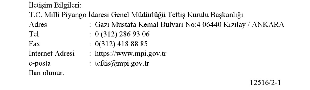 d) Bu duyuruda yer almayan hususlarla ilgili olarak; 657 sayılı Devlet Memurları Kanunu, Kamu Görevlerine İlk Defa Atanacaklar İçin Yapılacak Sınavlar Hakkında Genel Yönetmelik ile Milli Piyango İdaresi Genel Müdürlüğü Teftiş Kurulu Yönetmeliği hükümleri geçerlidir.