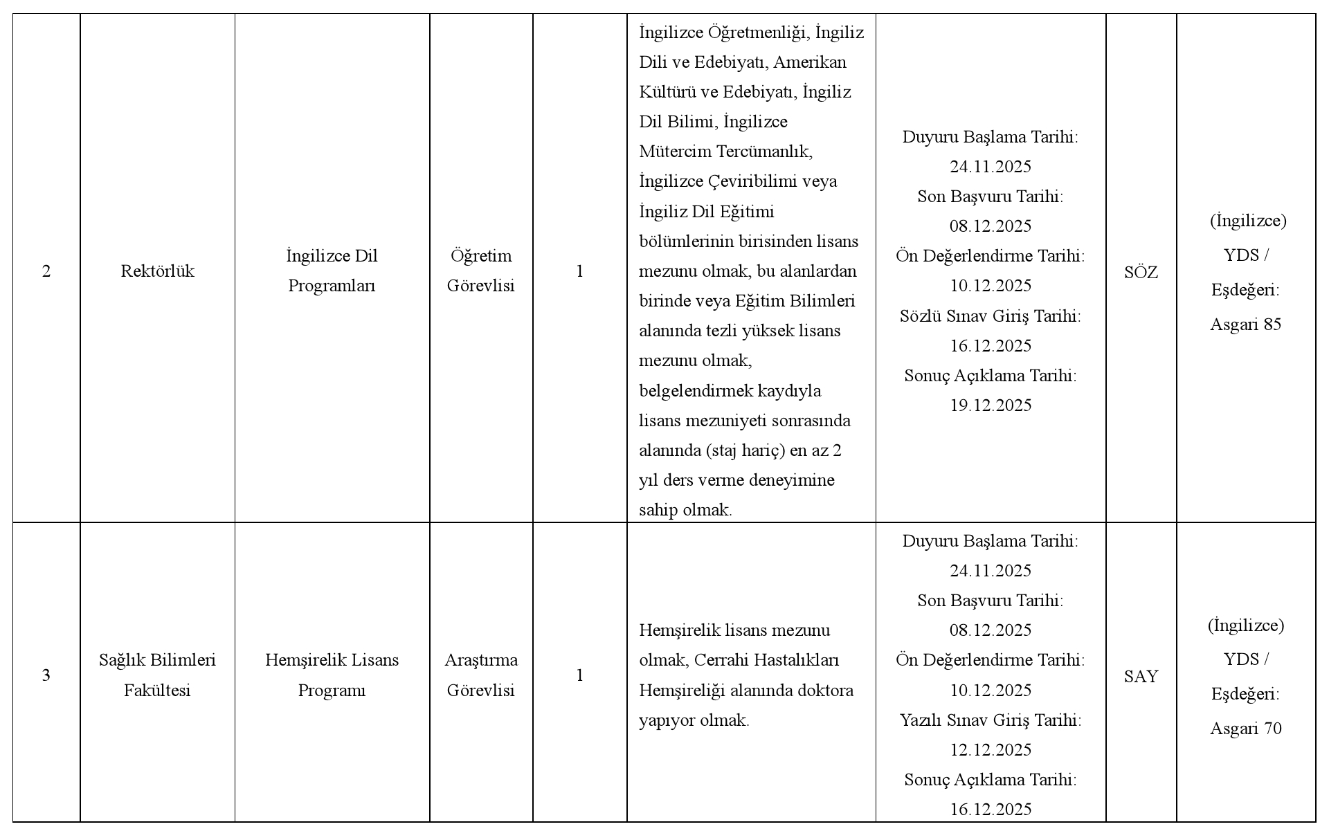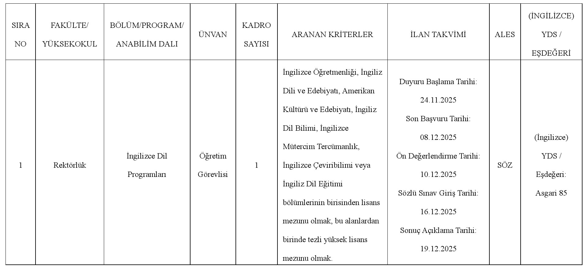 Üniversitemizin aşağıda belirtilen kadrolarına, 2547 sayılı Yükseköğretim Kanunu'nun ve Öğretim Üyesi Dışındaki Öğretim Elemanı Kadrolarına Yapılacak Atamalarda Uygulanacak Merkezi Sınav ile Giriş Sınavlarına İlişkin Usul ve Esaslar Hakkında Yönetmelik'in ilgili maddeleri uyarınca Öğretim
