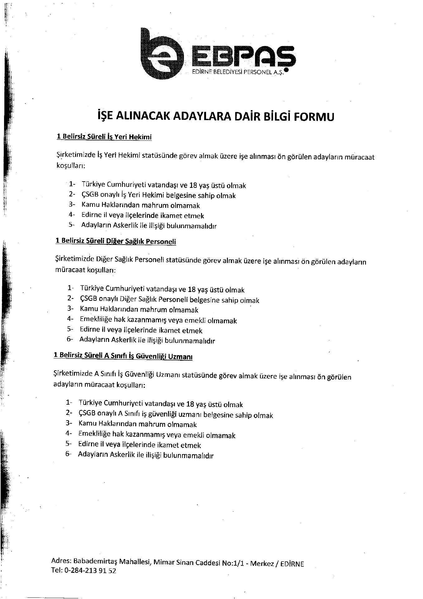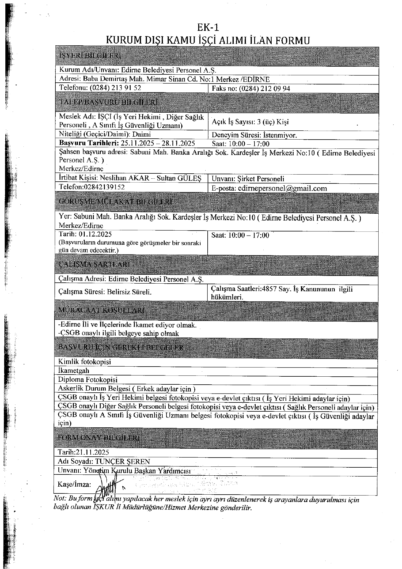 Ana sayfaDaimi İşçi İlanları Edirne Belediyesi 3 İşçi Alacak Edirne Belediyesi 3 İşçi Alacak. Son başvuru tarihi 28 Kasım 2025 Kaynak : İşkur İlan Giriş : 25 Kasım 2025 00:42, Son Güncelleme : 25 Kasım 2025 01:30 Yazdır Yorumlar (0) Abone Ol