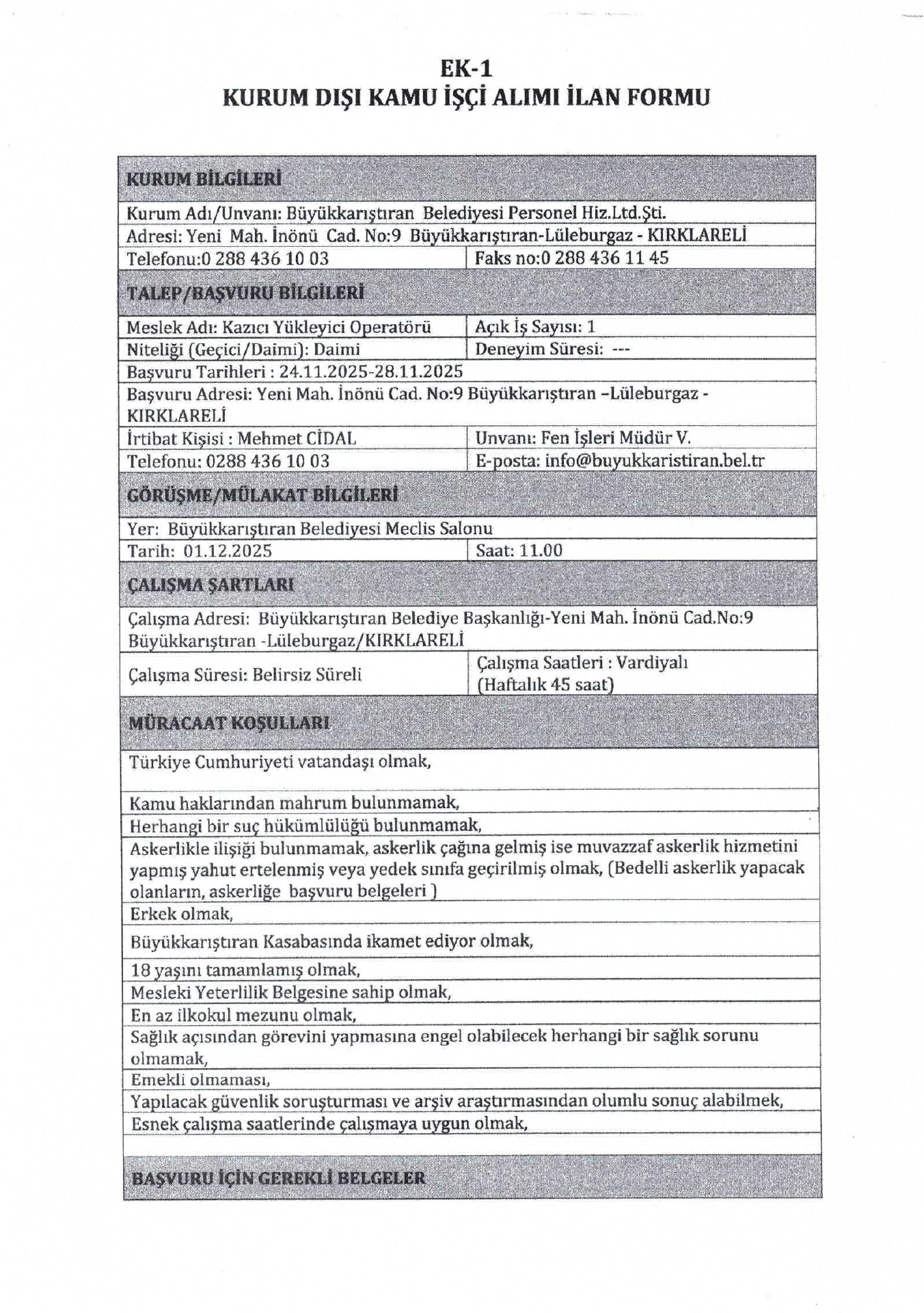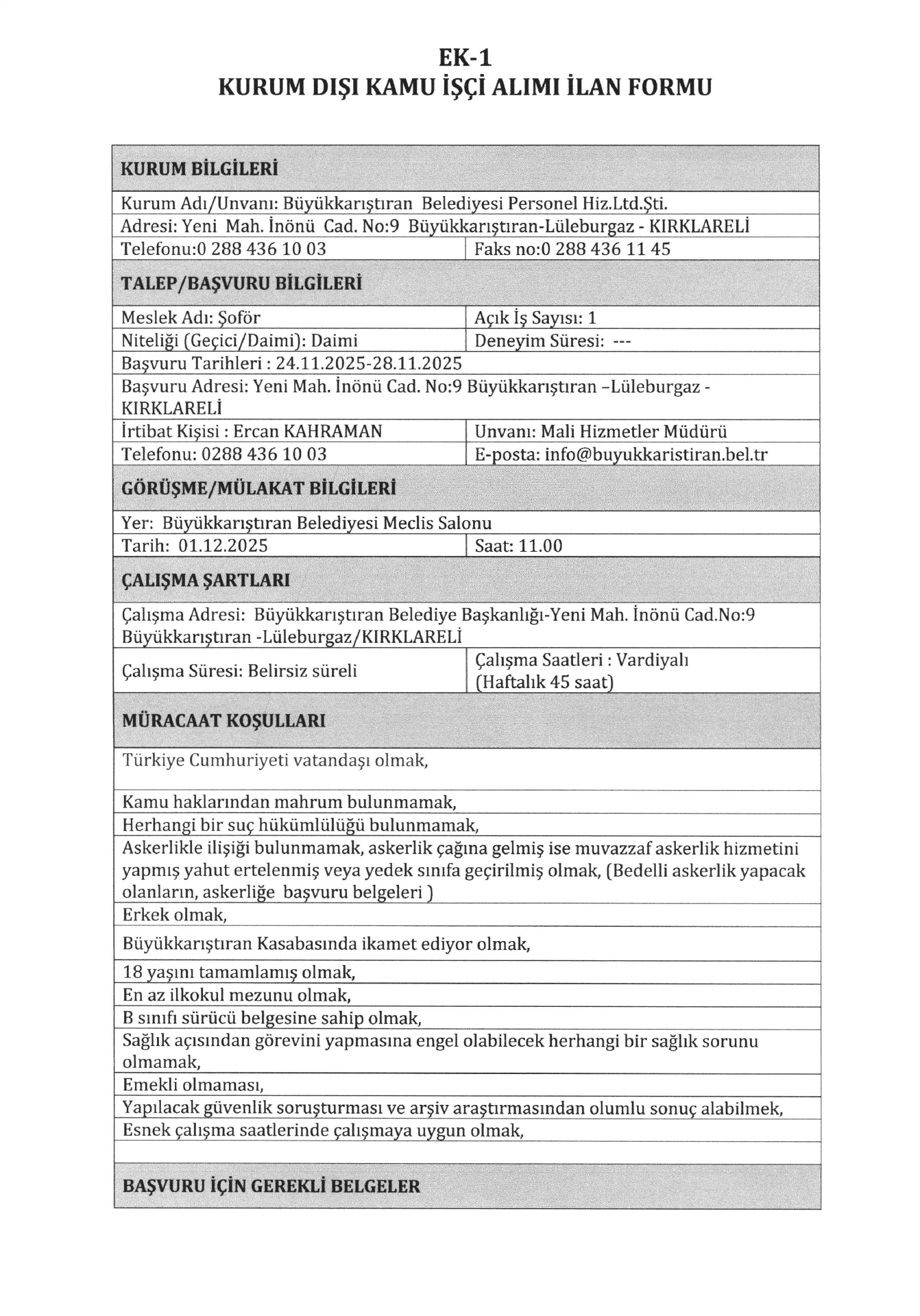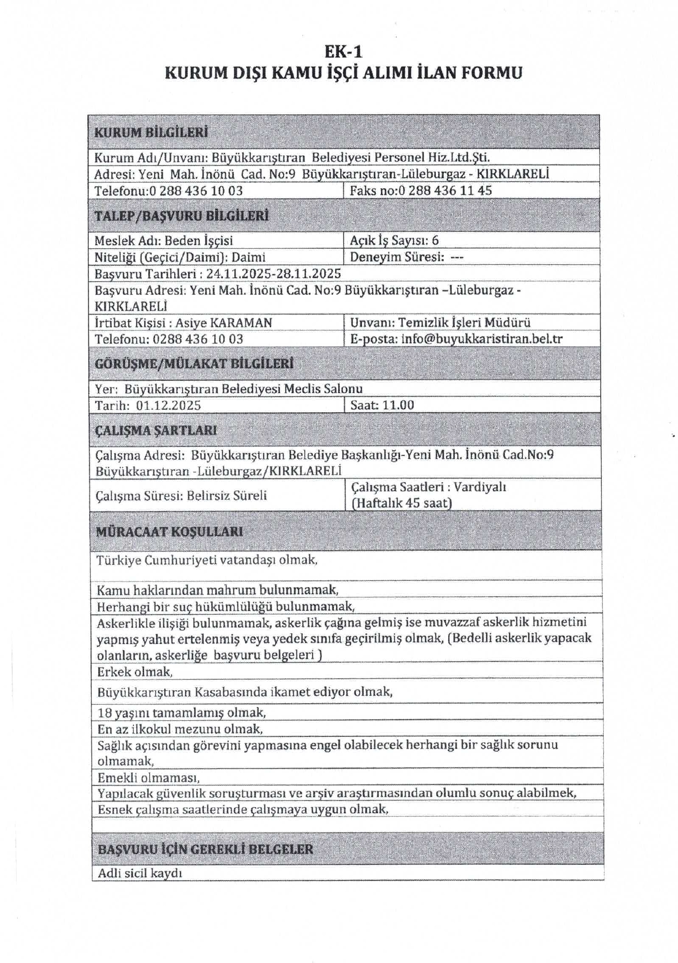 Ana sayfaDaimi İşçi İlanları Kırklareli Büyükkarıştıran Belediyesi 11 İşçi Alacak Kırklareli Büyükkarıştıran Belediyesi 11 İşçi Alacak. Son başvuru tarihi 28 Kasım 2025 Kaynak : İşkur İlan Giriş : 25 Kasım 2025 00:52, Son Güncelleme : 25 Kasım 2025 01:27 Yazdır Yorumlar (0) Abone Ol