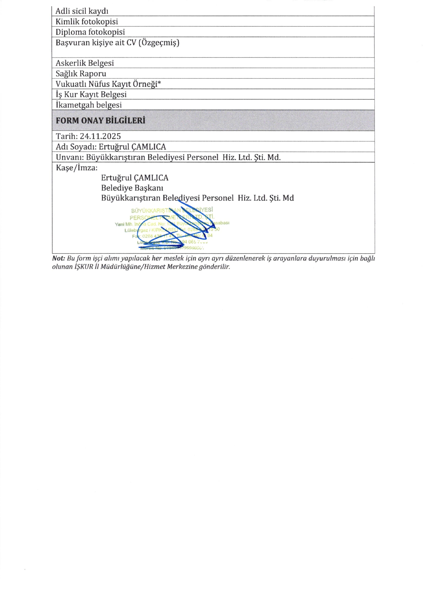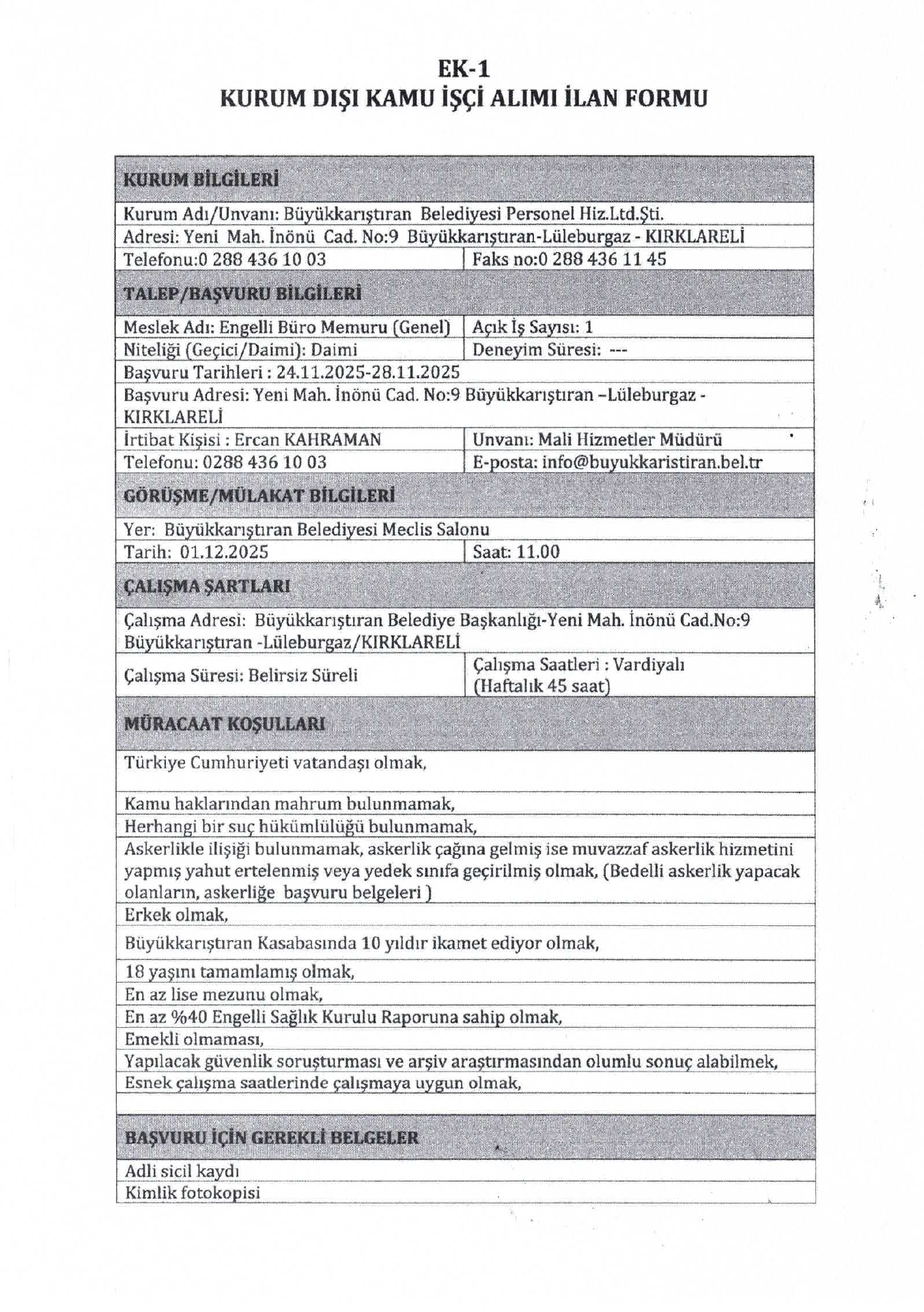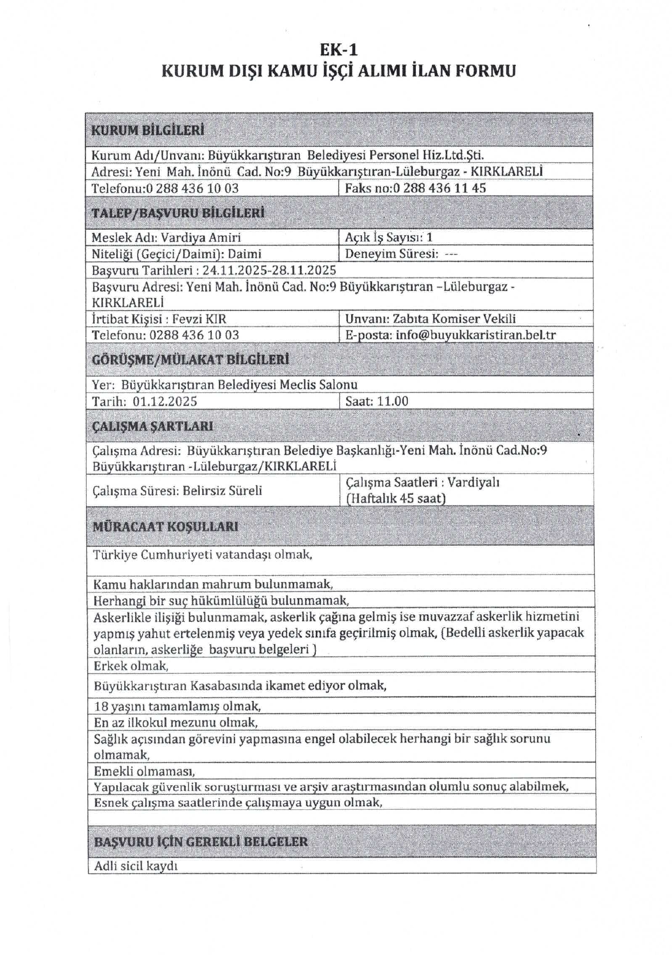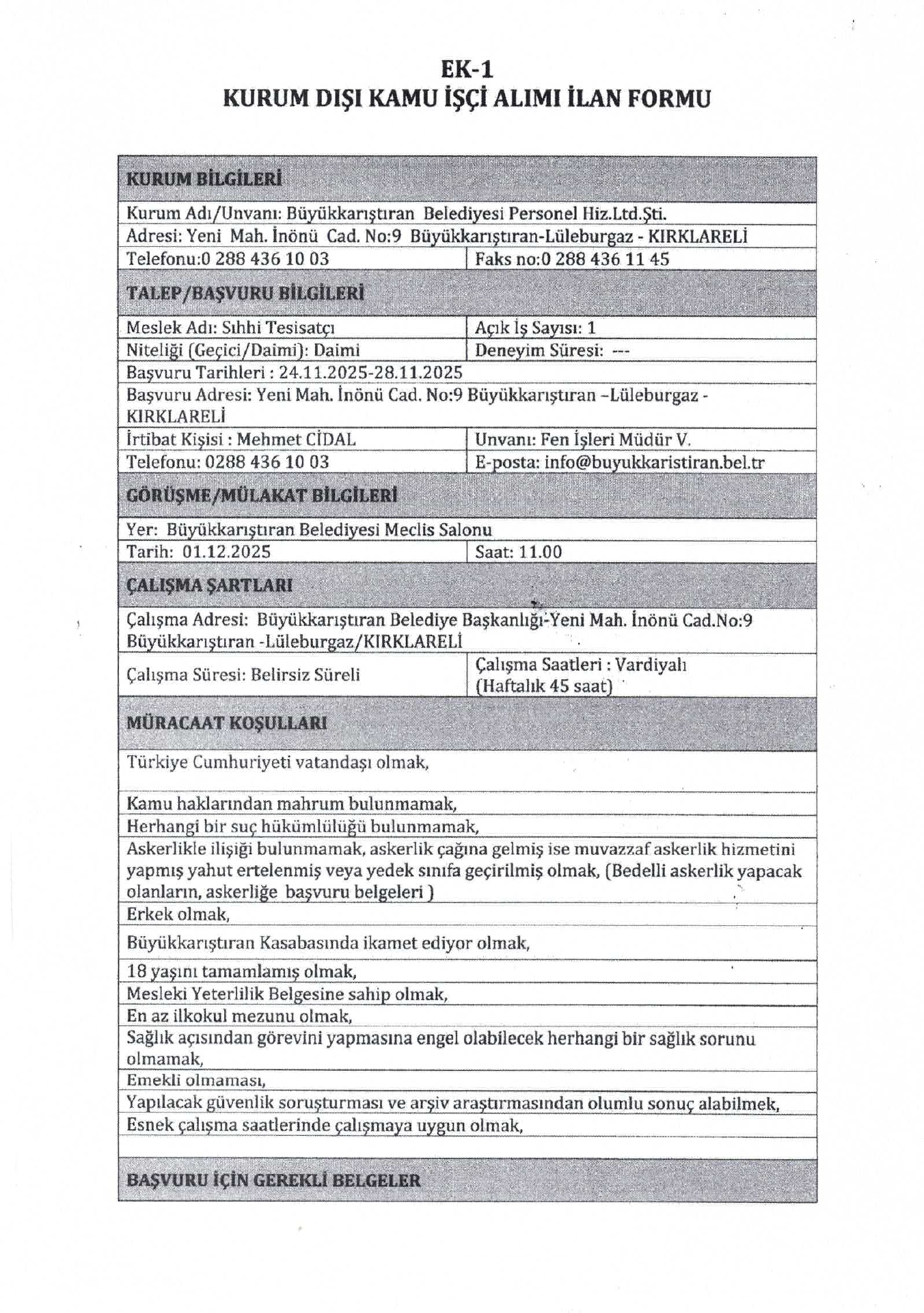 Ana sayfaDaimi İşçi İlanları Kırklareli Büyükkarıştıran Belediyesi 11 İşçi Alacak Kırklareli Büyükkarıştıran Belediyesi 11 İşçi Alacak. Son başvuru tarihi 28 Kasım 2025 Kaynak : İşkur İlan Giriş : 25 Kasım 2025 00:52, Son Güncelleme : 25 Kasım 2025 01:27 Yazdır Yorumlar (0) Abone Ol