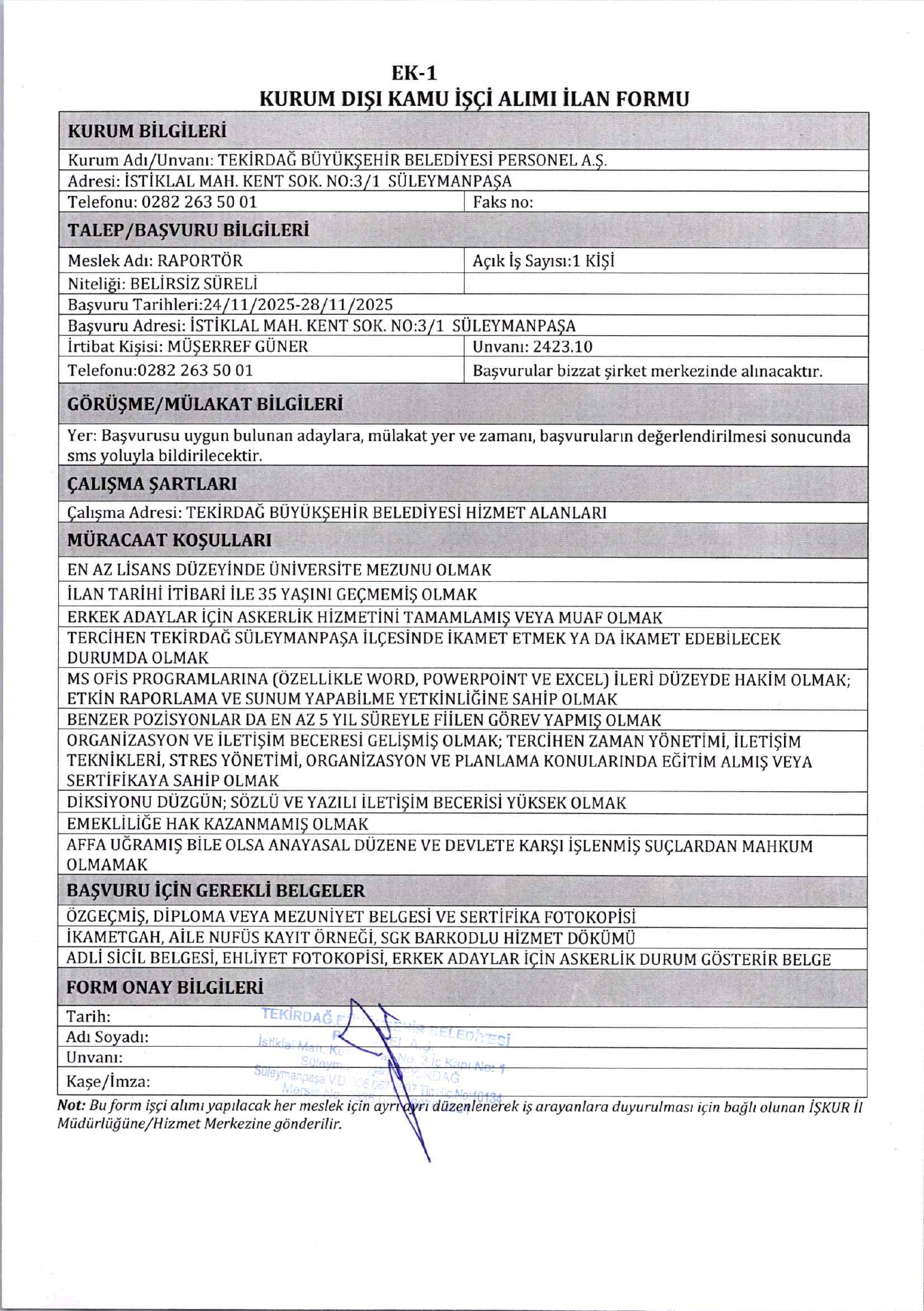 Ana sayfaDaimi İşçi İlanları Tekirdağ Büyükşehir Belediyesi 1 İşçi Alacak Manisa Agrospil Tarım 2 İşçi Alacak. Son başvuru tarihi 1 Aralık 2025 Kaynak : İşkur İlan Giriş : 25 Kasım 2025 00:58, Son Güncelleme : 25 Kasım 2025 01:23 Yazdır Yorumlar (0) Abone Ol