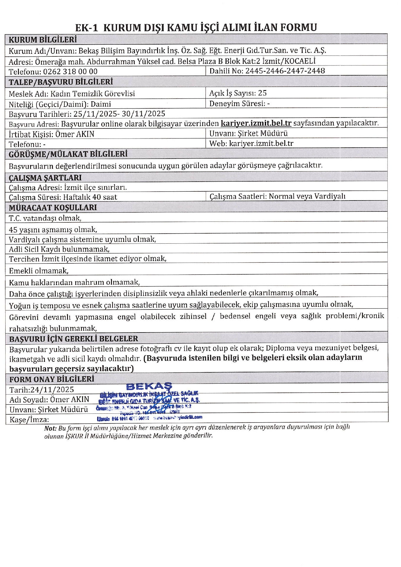 Ana sayfaDaimi İşçi İlanları Kocaeli Bekaş Bilişim 25 İşçi Alacak Kocaeli Bekaş Bilişim 25 İşçi Alacak. Son başvuru tarihi 30 Kasım 2025 Kaynak : İşkur İlan Giriş : 26 Kasım 2025 00:18, Son Güncelleme : 26 Kasım 2025 01:37 Yazdır Yorumlar (0) Abone Ol