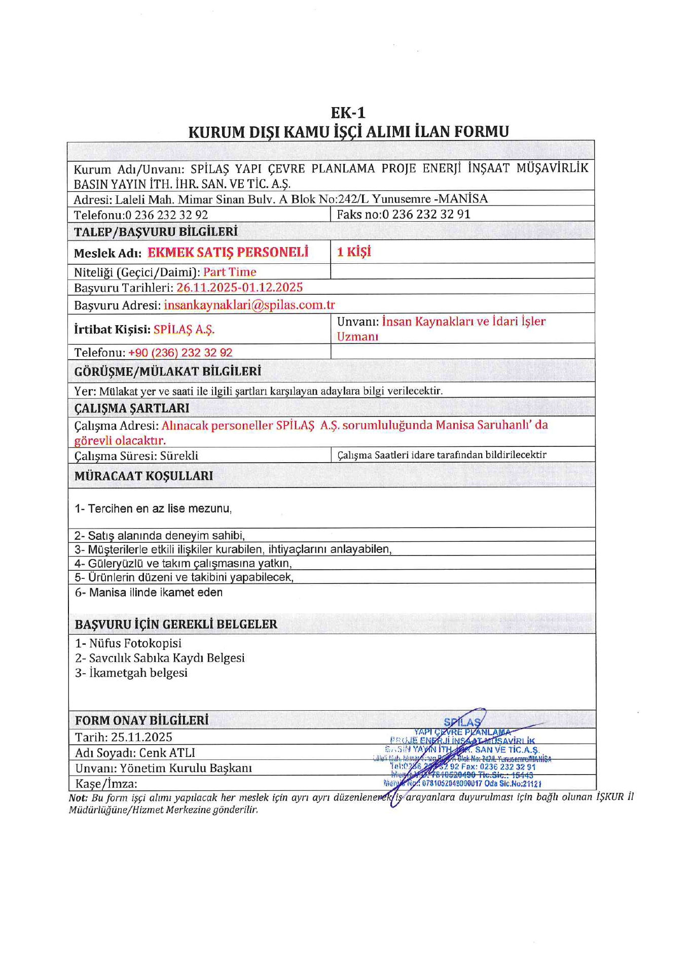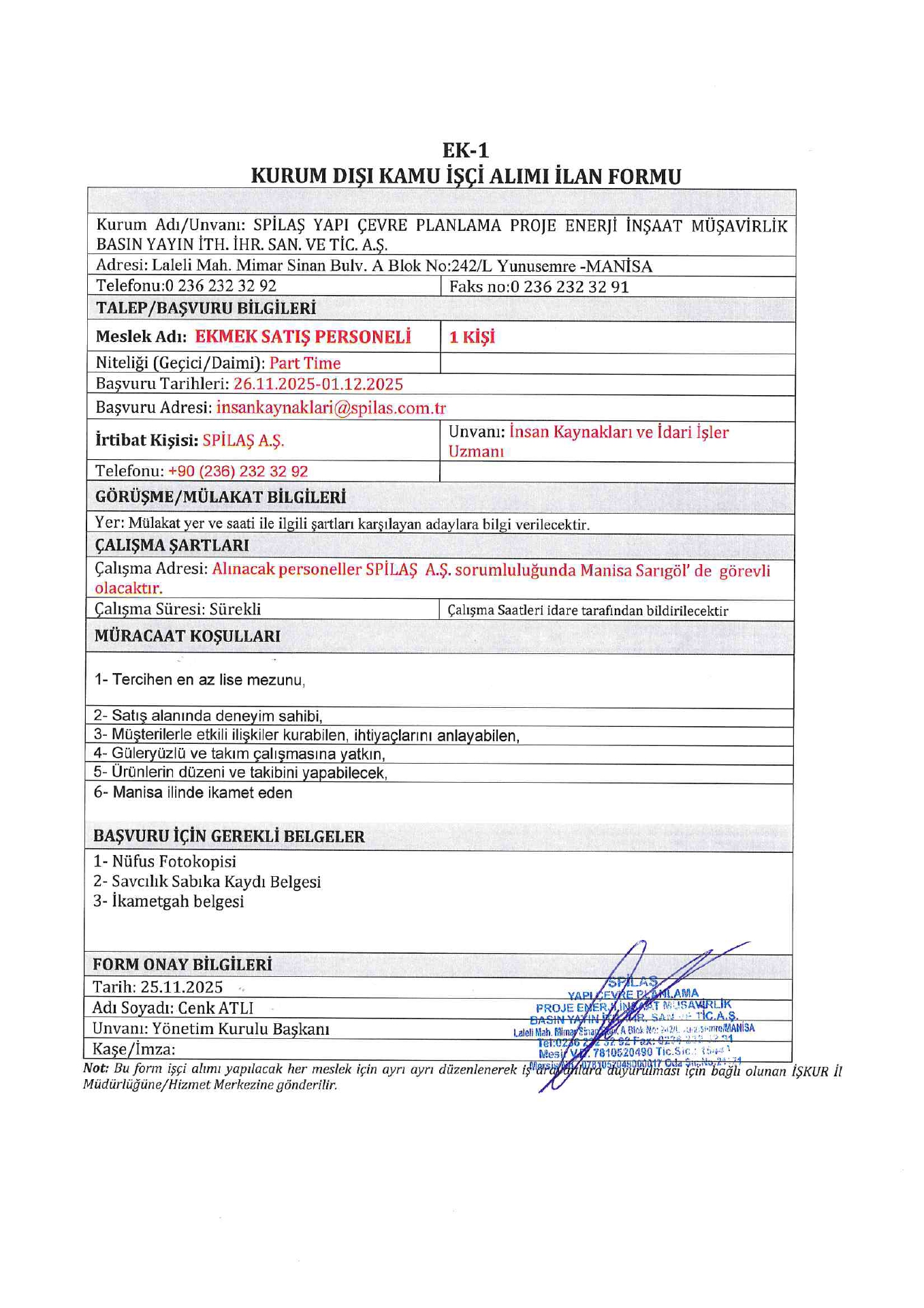 Ana sayfaDaimi İşçi İlanları Manisa Spilaş Yapı 2 İşçi Alacak Manisa Spilaş Yapı 2 İşçi Alacak. Son başvuru tarihi 1 Aralık 2025 Kaynak : İşkur İlan Giriş : 26 Kasım 2025 00:51, Son Güncelleme : 26 Kasım 2025 01:26 Yazdır Yorumlar (0) Abone Ol