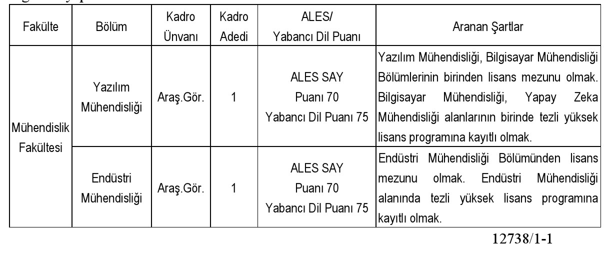 Üniversitemiz ilgili Birimlerine, 2547 sayılı Yükseköğretim Kanunu ile "Öğretim Üyesi Dışındaki Öğretim Elemanı Kadrolarına Yapılacak Atamalarda Uygulanacak Merkezi Sınav ile Giriş Sınavlarına İlişkin Usul ve Esaslar Hakkında Yönetmelik"te belirtilen şartları yerine getirmiş olmak kaydıyla araştırma görevlileri alınacaktır.