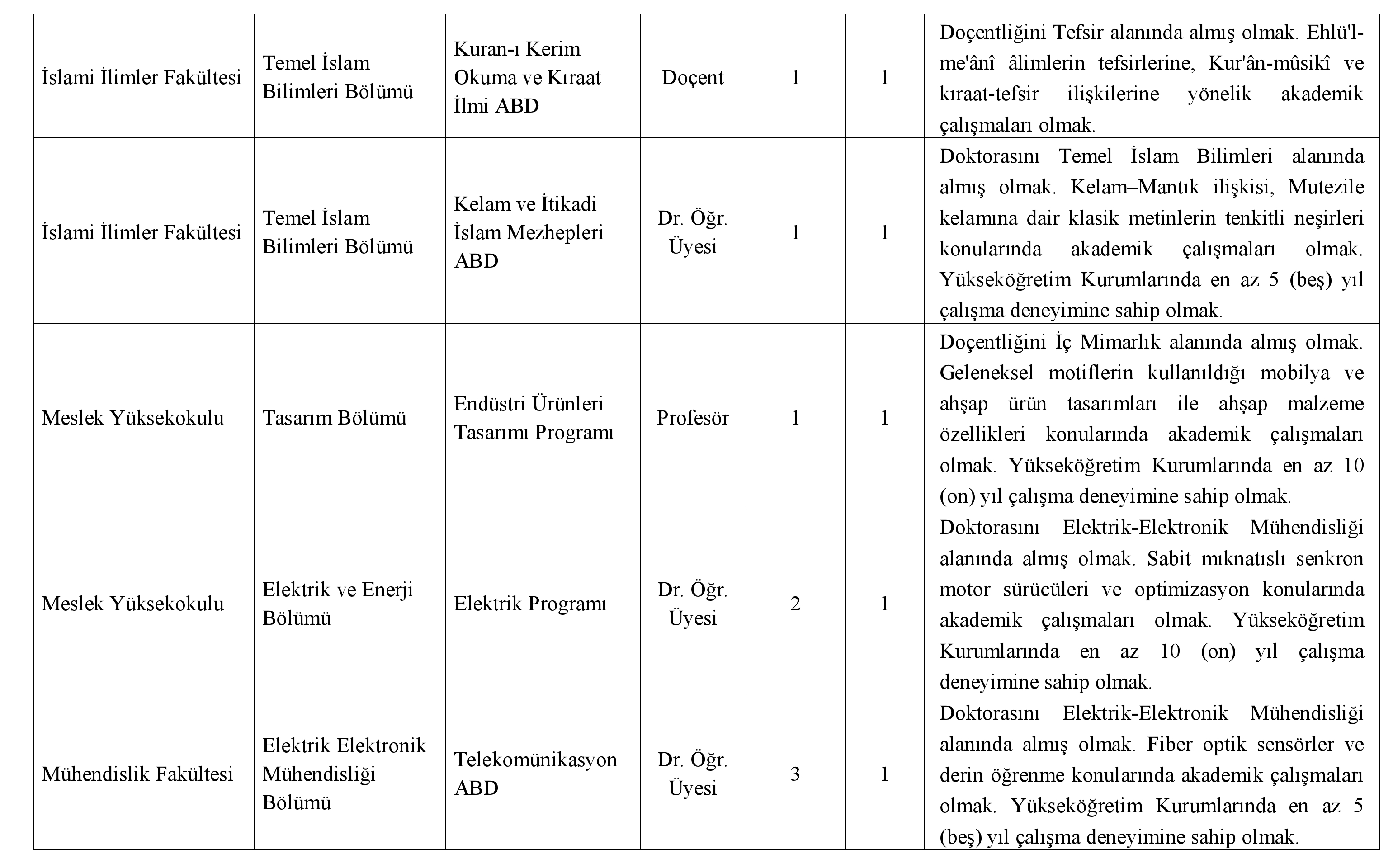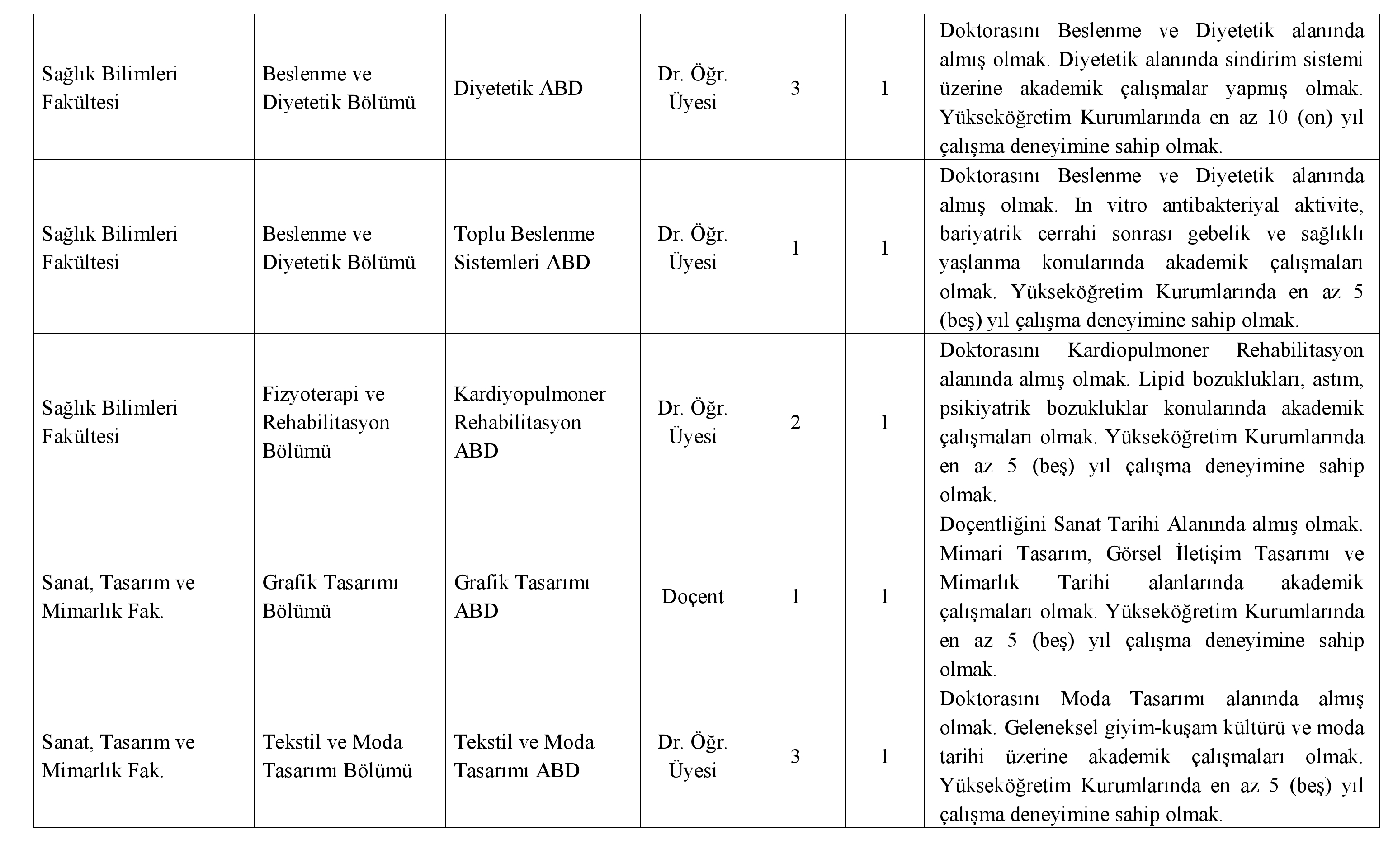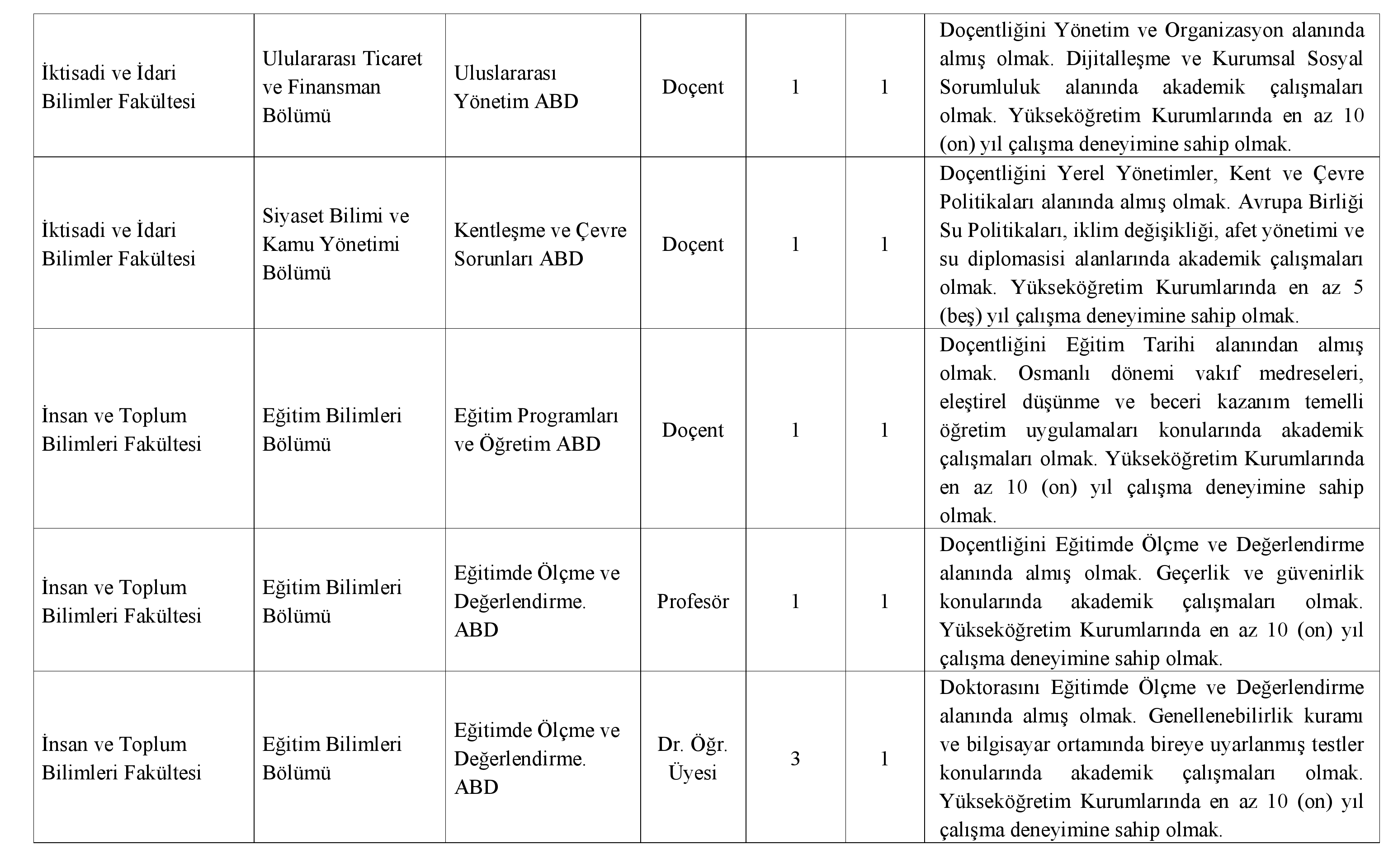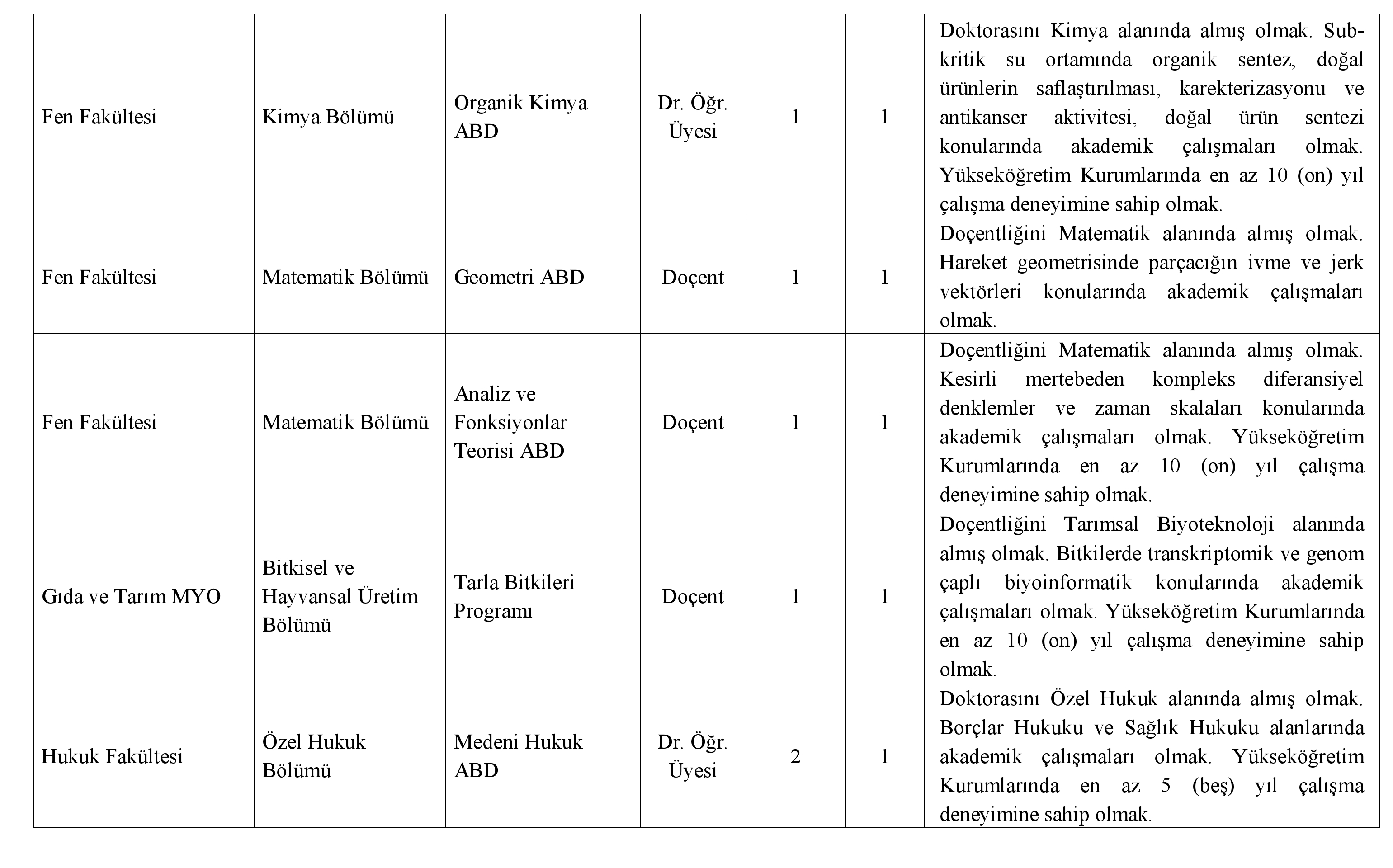 Üniversitemize 2547 sayılı Yükseköğretim Kanunu'nun ilgili maddeleri gereğince ve Öğretim Üyeliğine Yükseltilme ve Atanma Yönetmeliği'nin ilgili maddeleri uyarınca aşağıda unvanı, nitelikleri ve sayıları belirtilen kadrolara öğretim üyeleri alınacaktır.