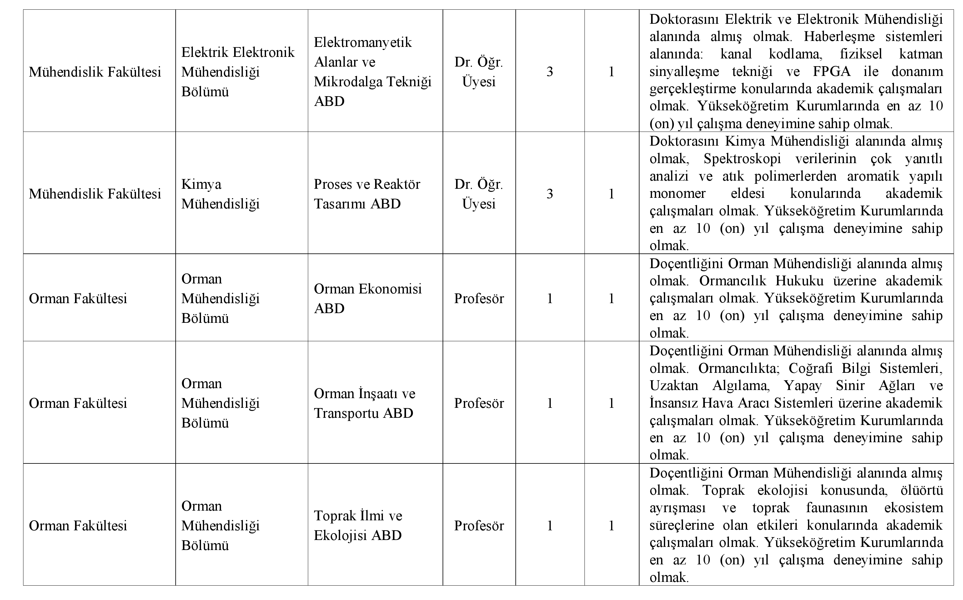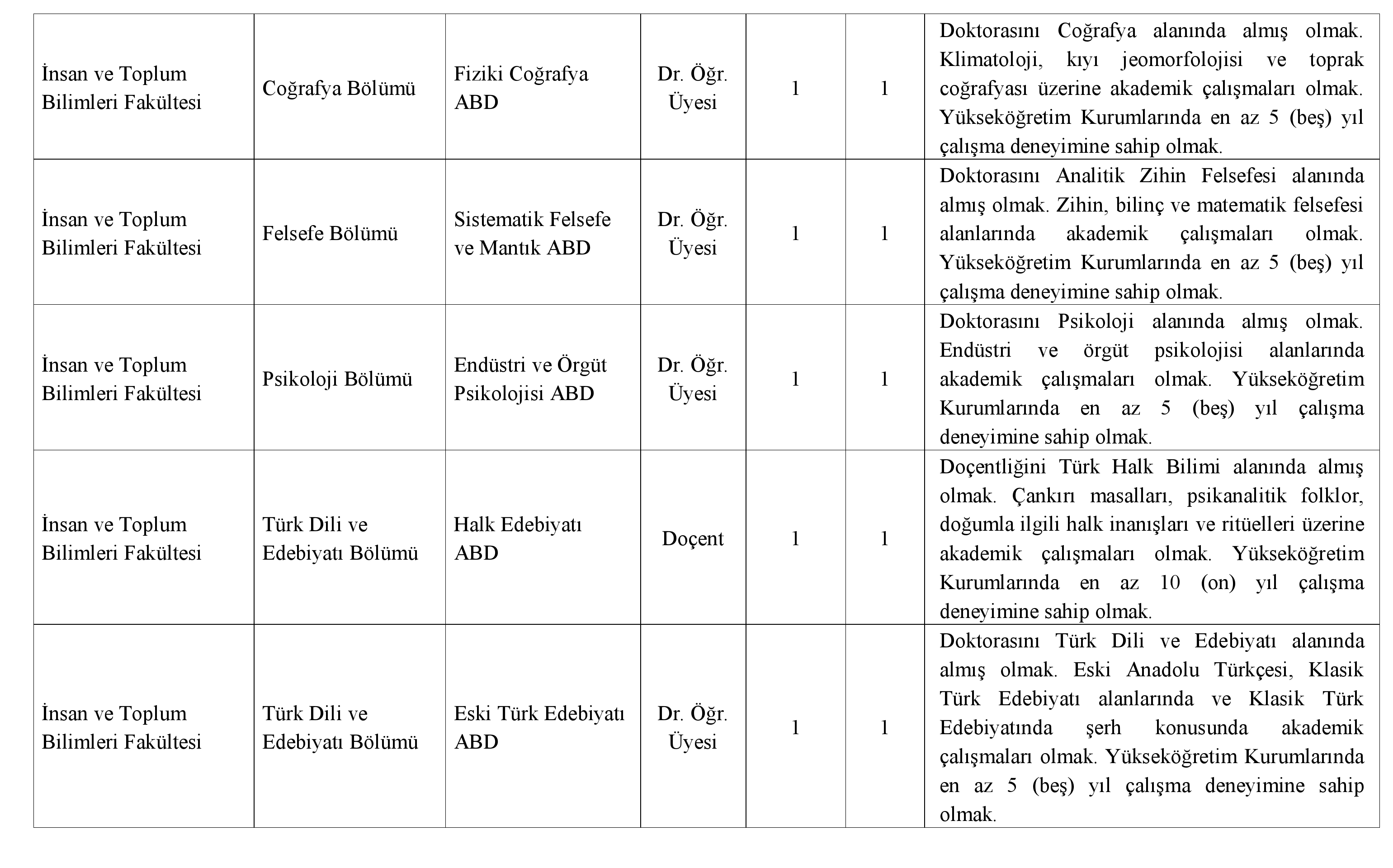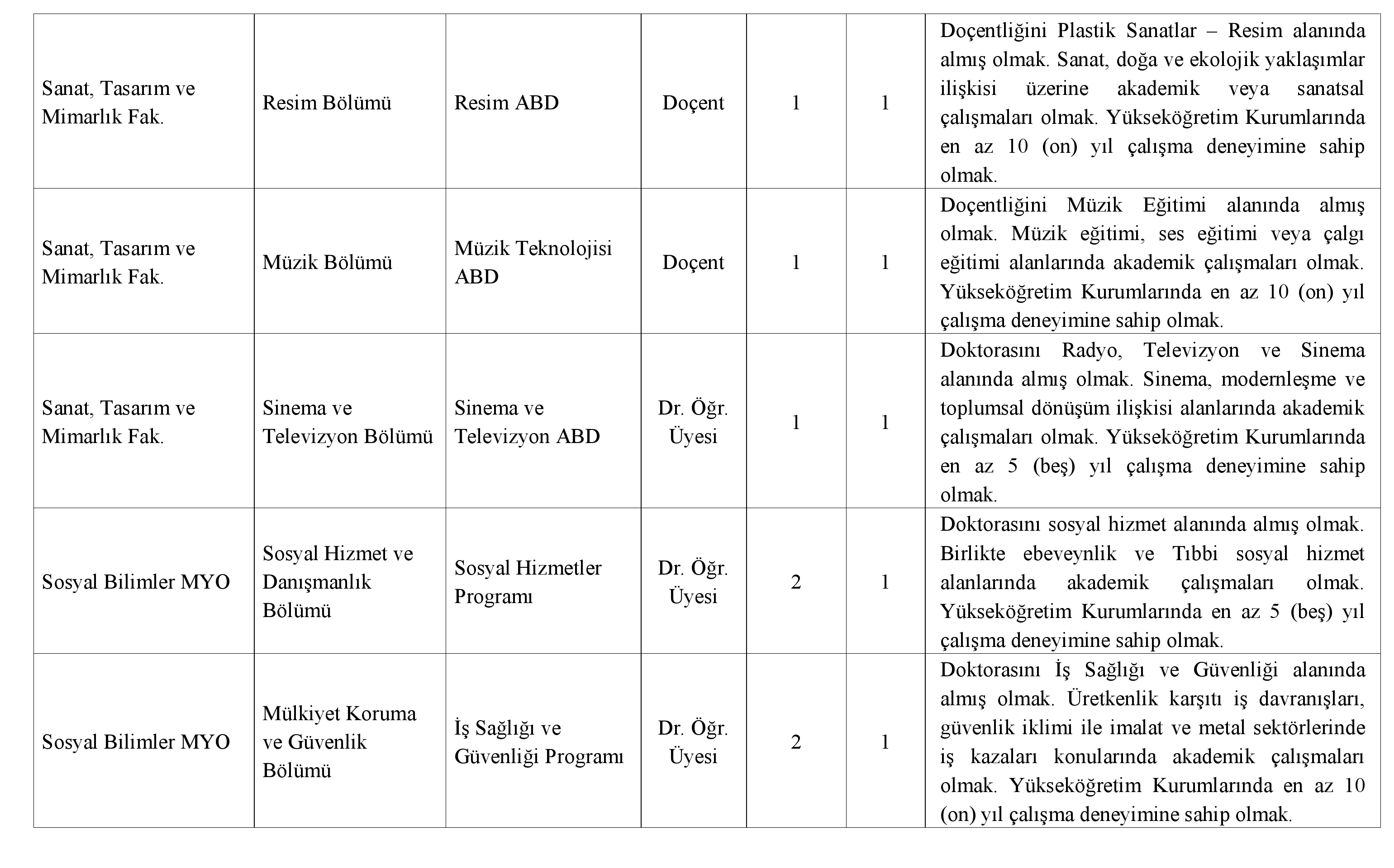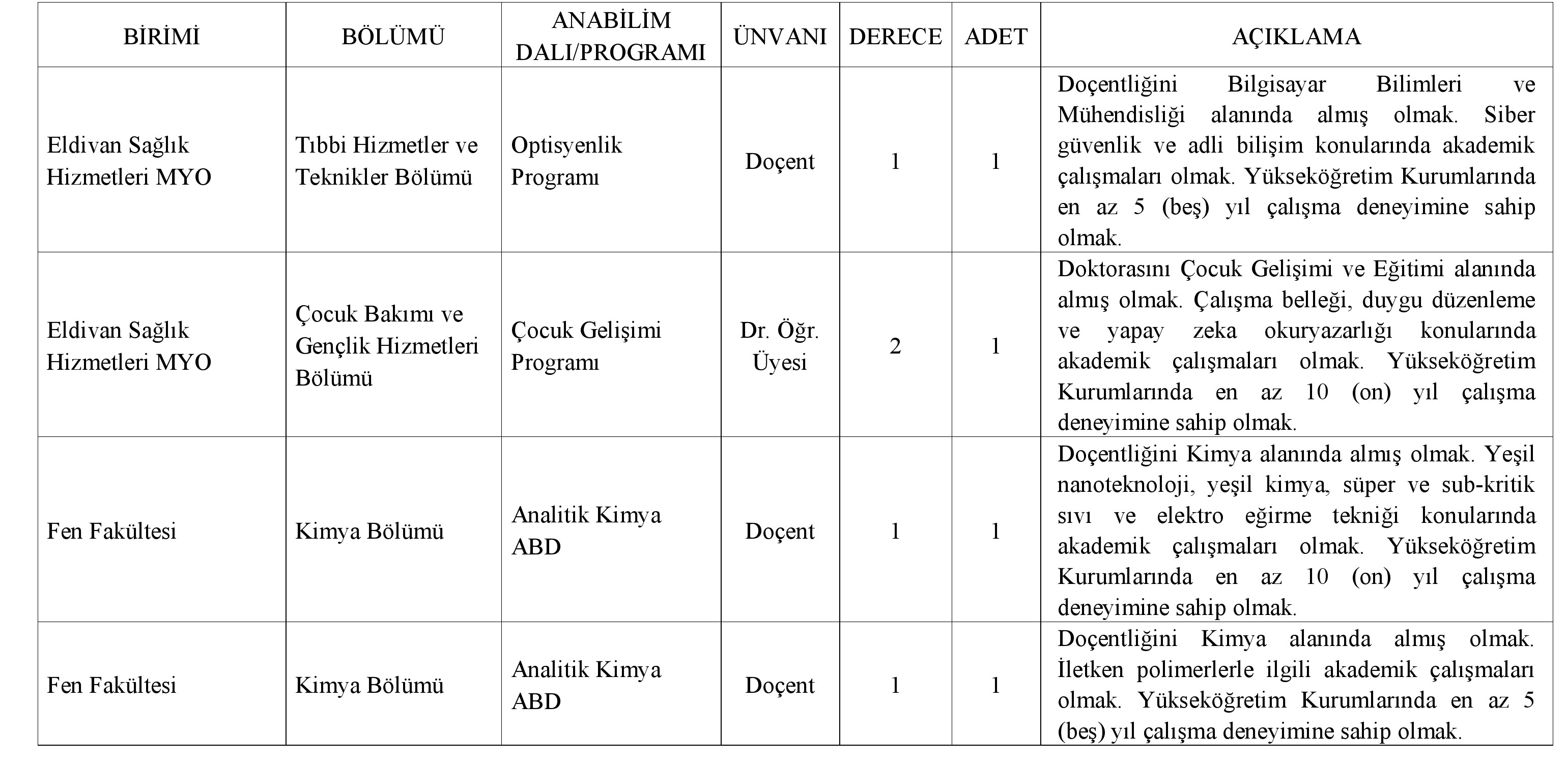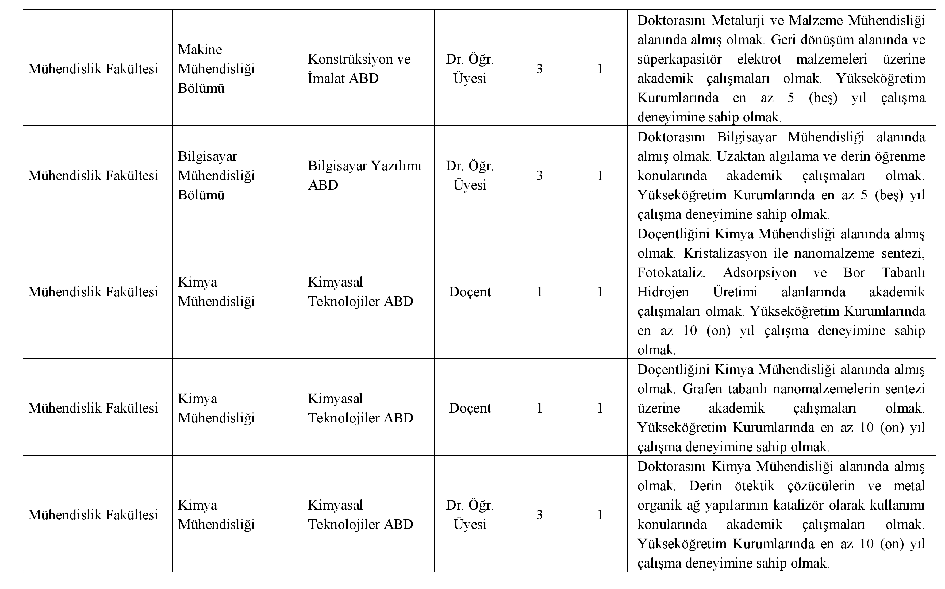 Üniversitemize 2547 sayılı Yükseköğretim Kanunu'nun ilgili maddeleri gereğince ve Öğretim Üyeliğine Yükseltilme ve Atanma Yönetmeliği'nin ilgili maddeleri uyarınca aşağıda unvanı, nitelikleri ve sayıları belirtilen kadrolara öğretim üyeleri alınacaktır.