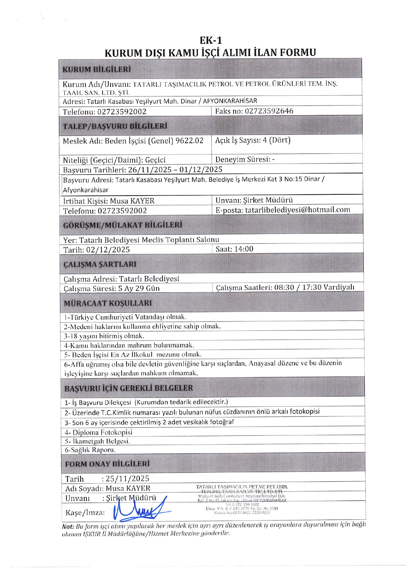 Afyonkarahisar Tatarlı Taşımacılık Geçici 4 İşçi Alacak. Son başvuru tarihi 1 Aralık 2025