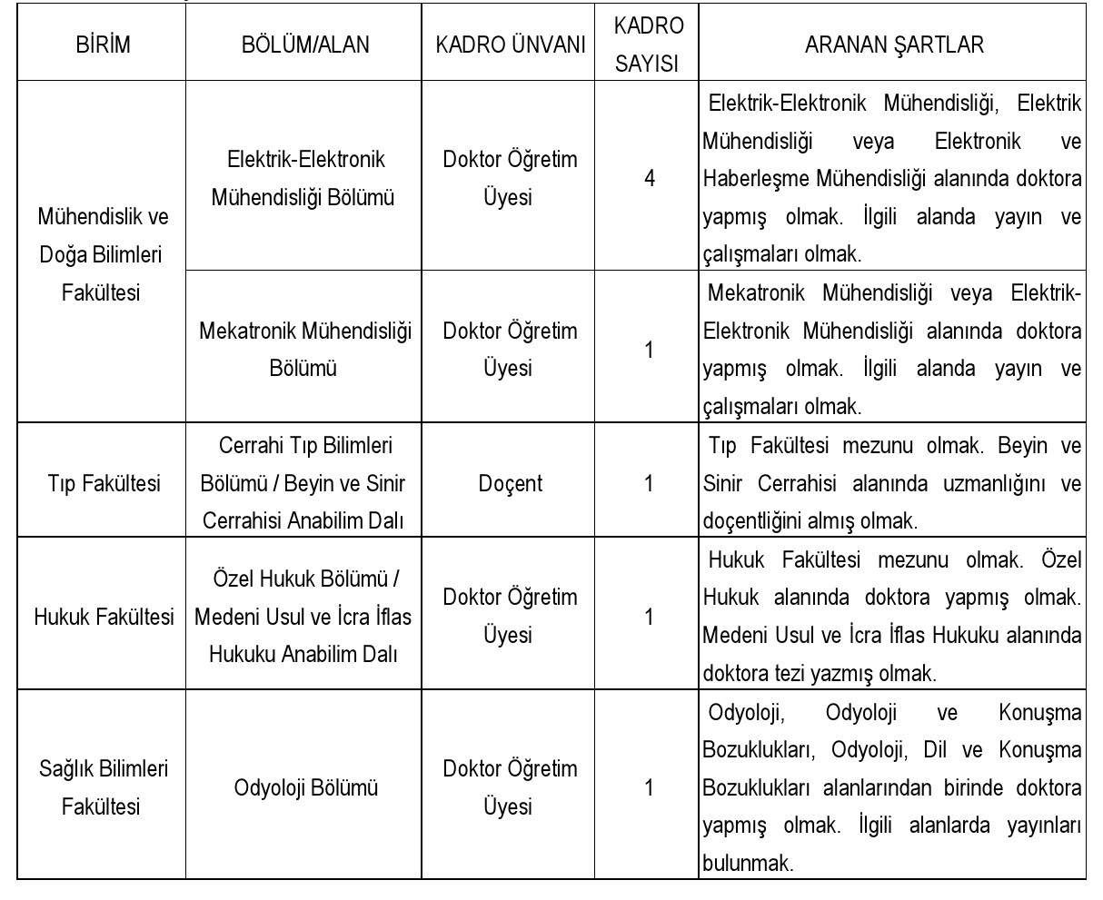Üniversitemize 2547 sayılı Kanun'un ilgili maddeleri ile Öğretim Üyeliğine Yükseltilme ve Atanma Yönetmeliği'nin ilgili maddeleri uyarınca aşağıdaki tabloda belirtilen Fakülte, Yüksekokul ve Meslek Yüksekokulu bünyesine tam zamanlı öğretim üyesi alınacaktır.