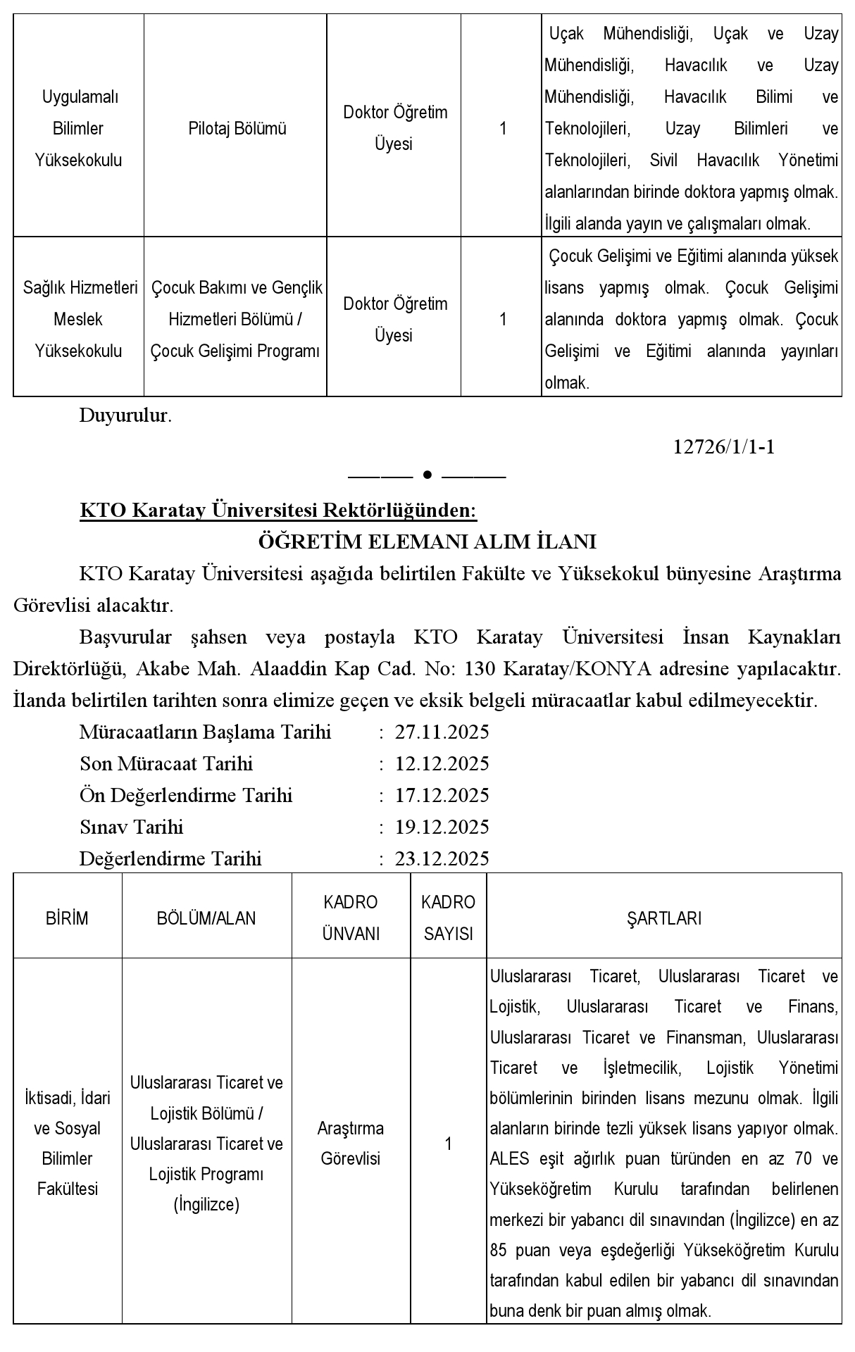 KTO Karatay Üniversitesi Öğretim Üyesi ve Elemanı Alım İlanı