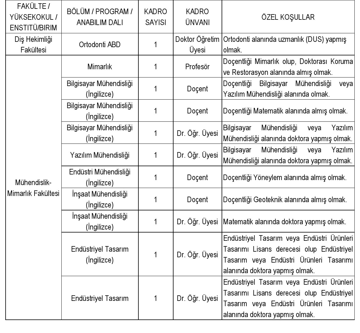 hükümlerinde aranan koşulları yerine getirmiş olmak kaydı ile aylık ve özlük hakları yönünden 4857 sayılı İş Kanunu hükümlerine tabi Diş Hekimliği Fakültesi, Mühendislik-Mimarlık Fakültesi, İktisadi ve İdari Bilimler Fakültesi, Tıp Fakültesi ve Meslek Yüksekokulu bünyesinde çeşitli alanlarda; 15 Öğretim Üyesi alınacaktır. İlana konu olan kadrolar tam zamanlıdır.
