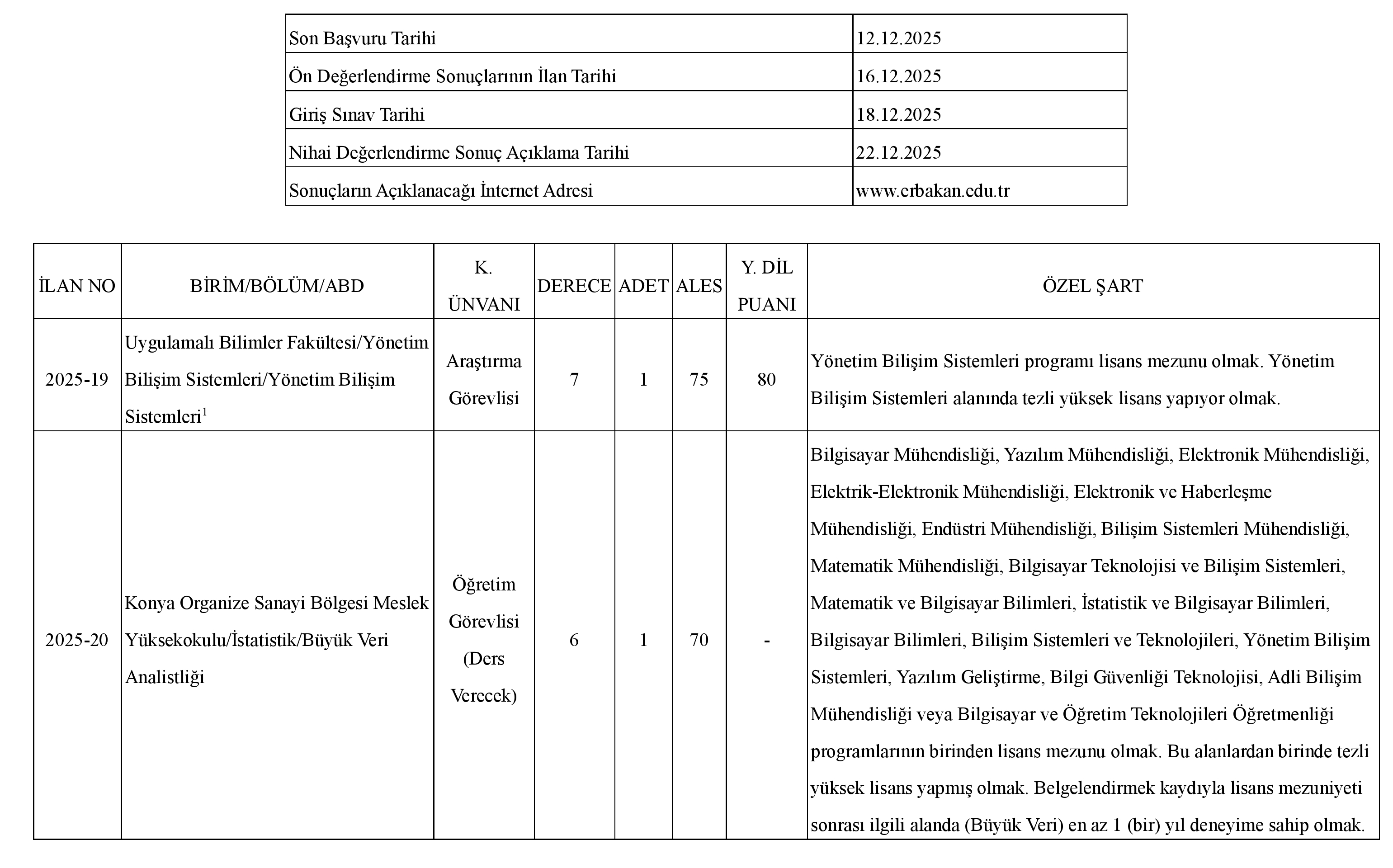 Necmettin Erbakan Üniversitesi Öğretim Elemanı Alım İlanı. Son başvuru tarihi 12 Aralık 2025