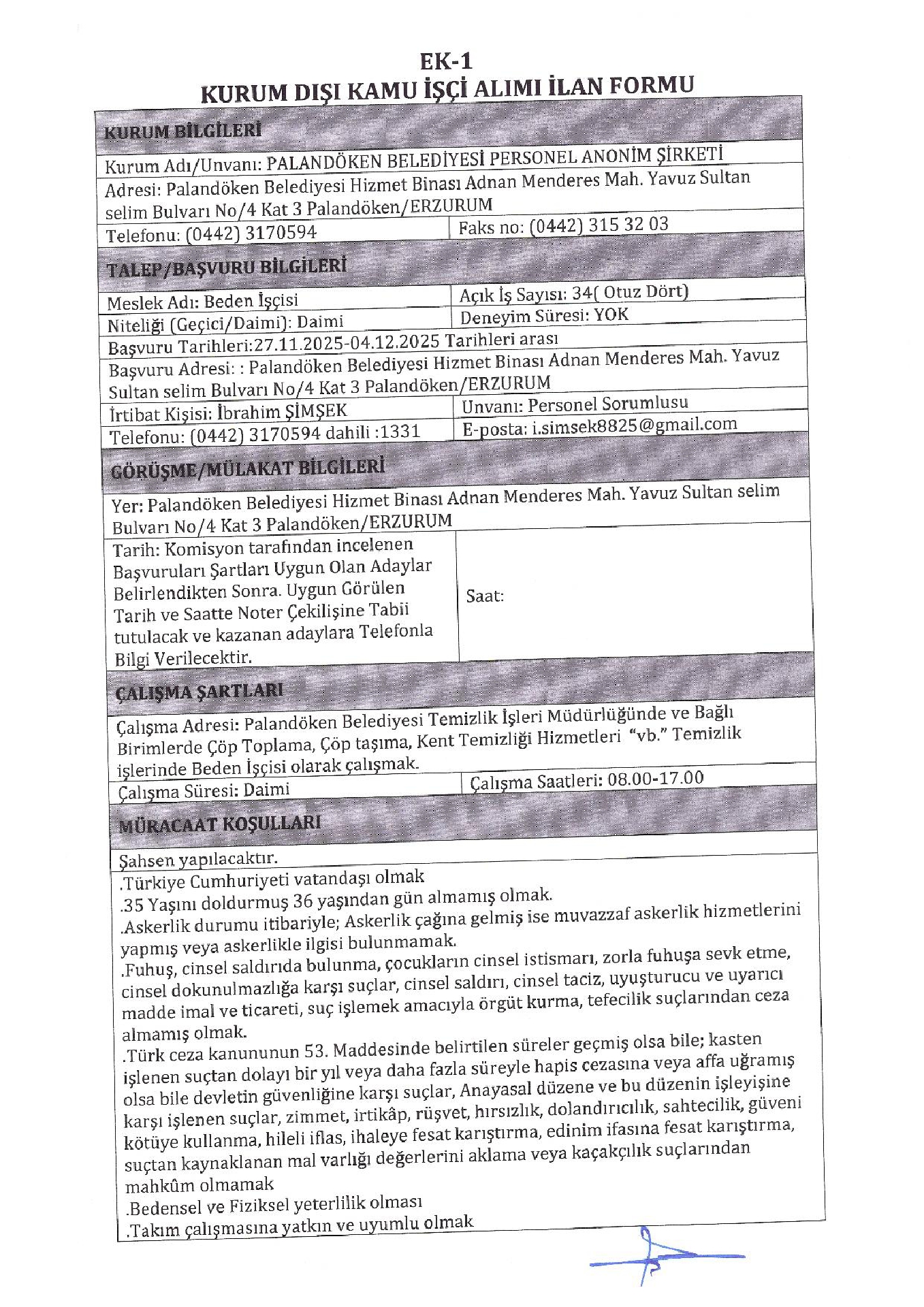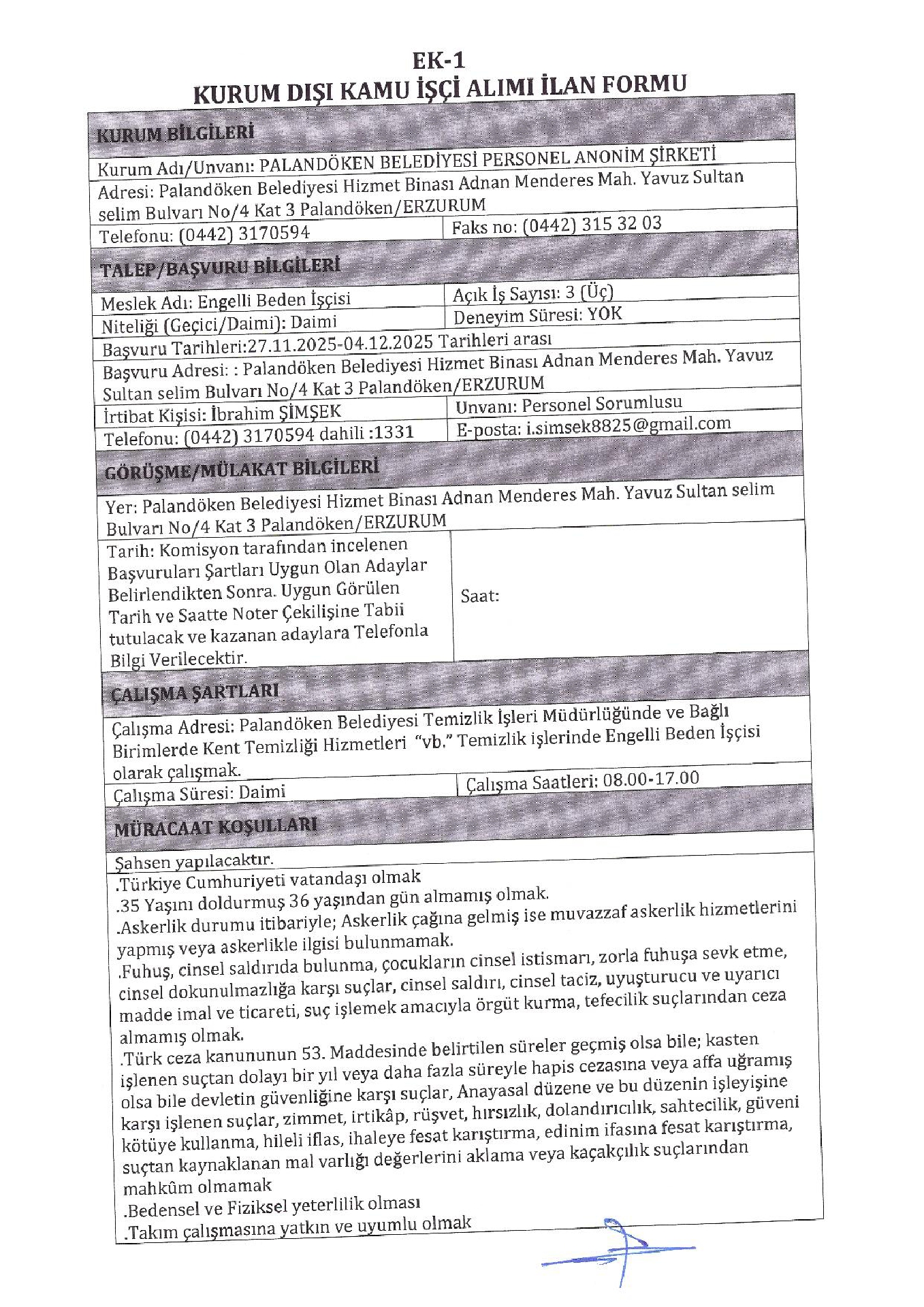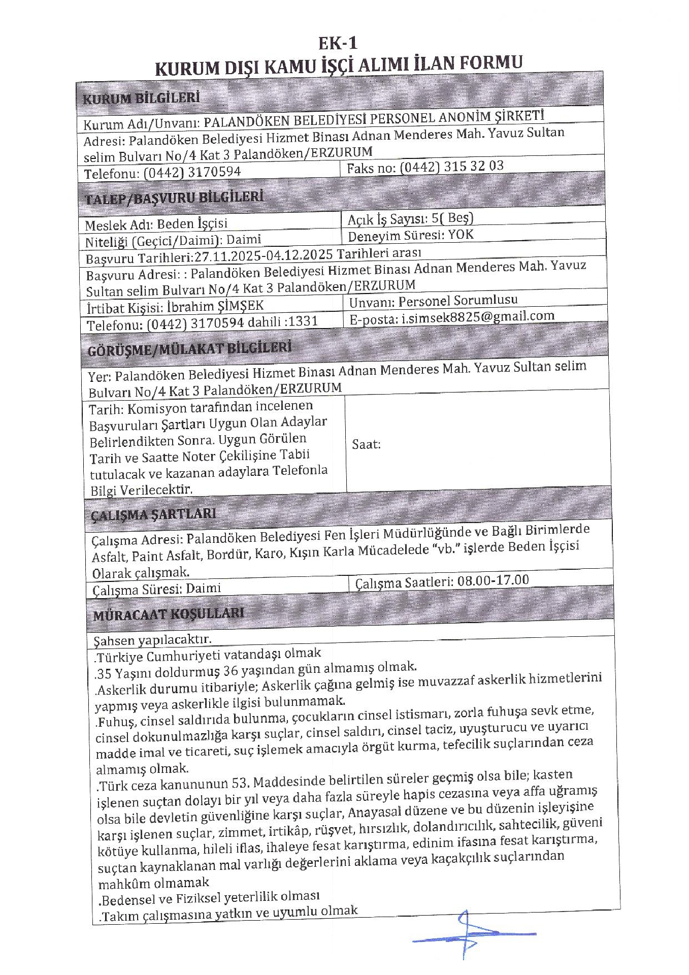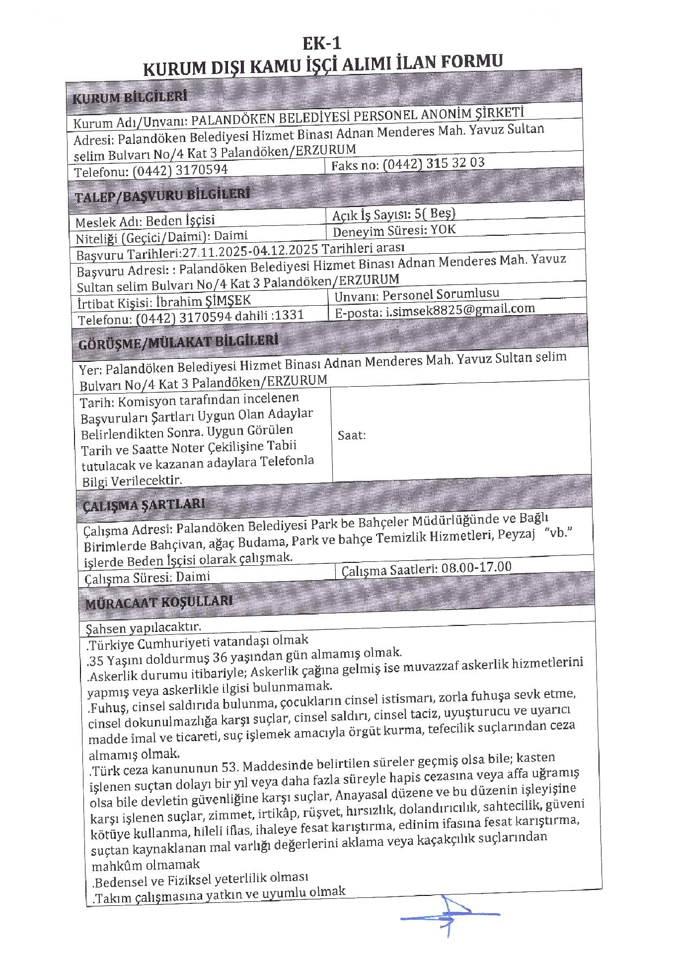 Erzurum Palandöken Belediyesi 61 İşçi Alacak. Son başvuru tarihi 4 Aralık 2025