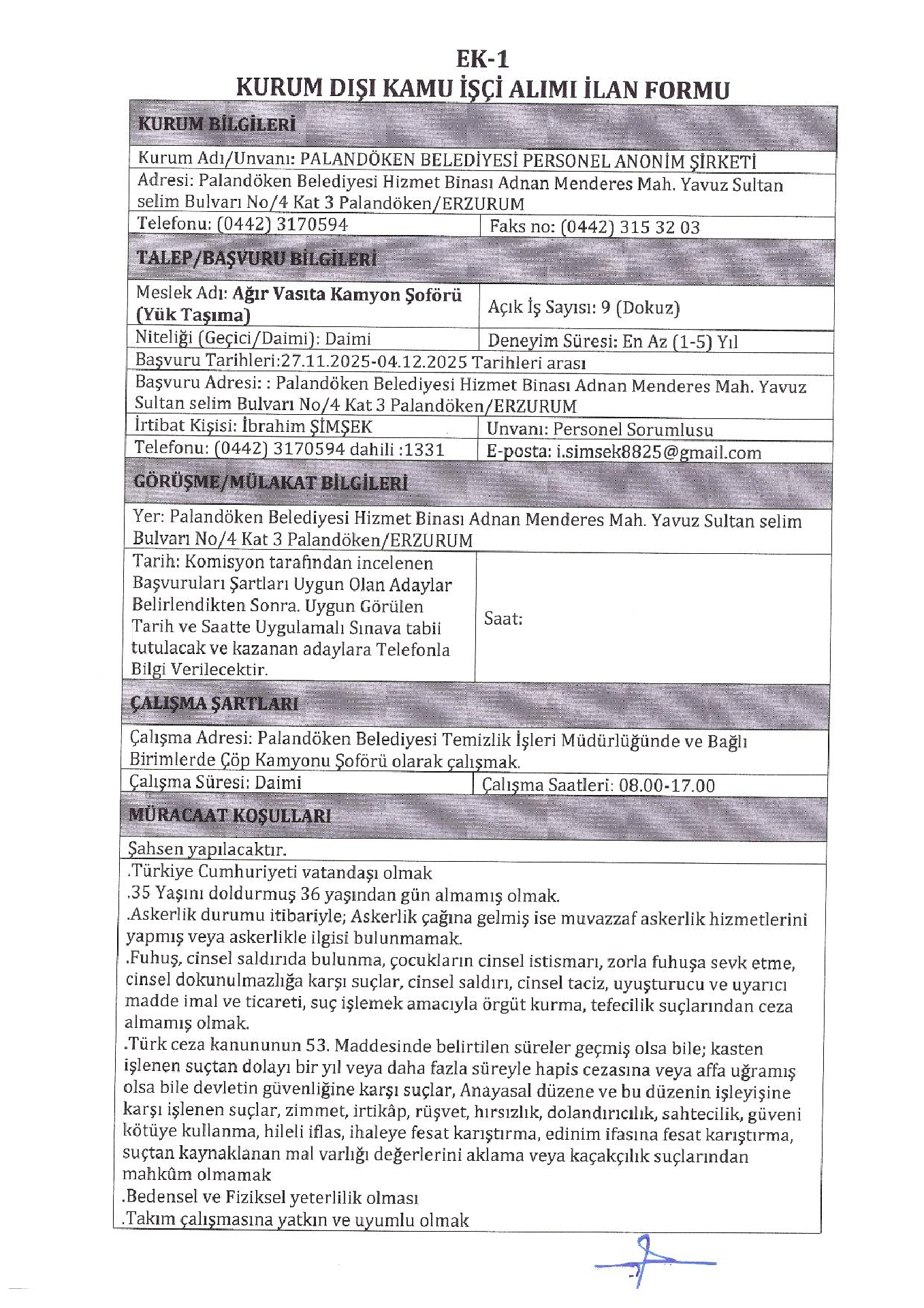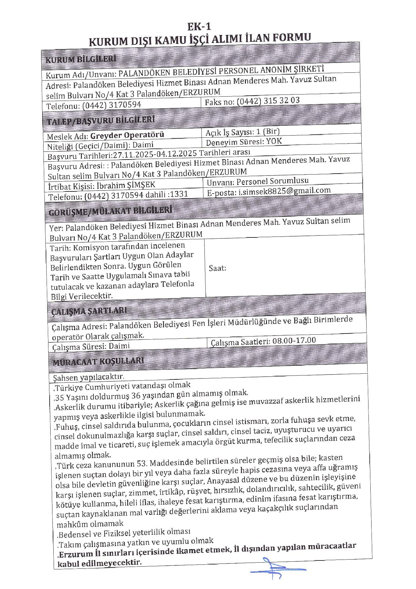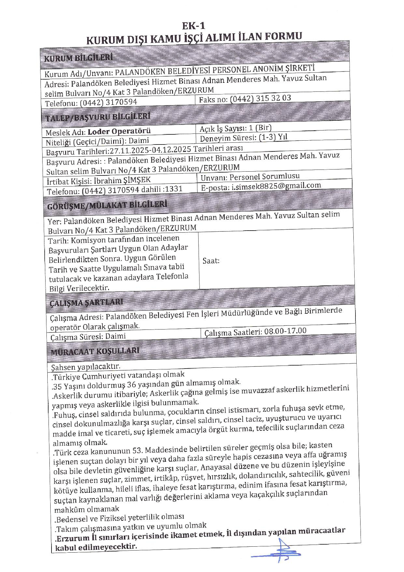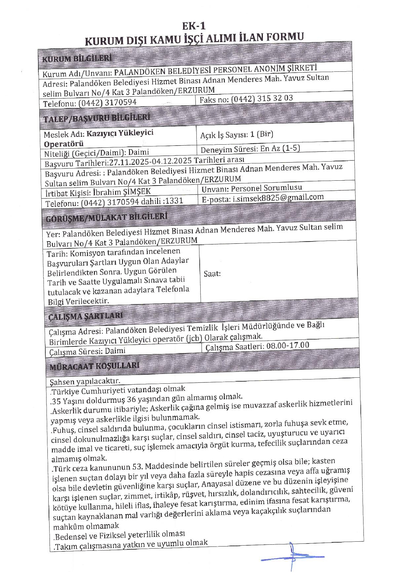 Erzurum Palandöken Belediyesi 61 İşçi Alacak. Son başvuru tarihi 4 Aralık 2025