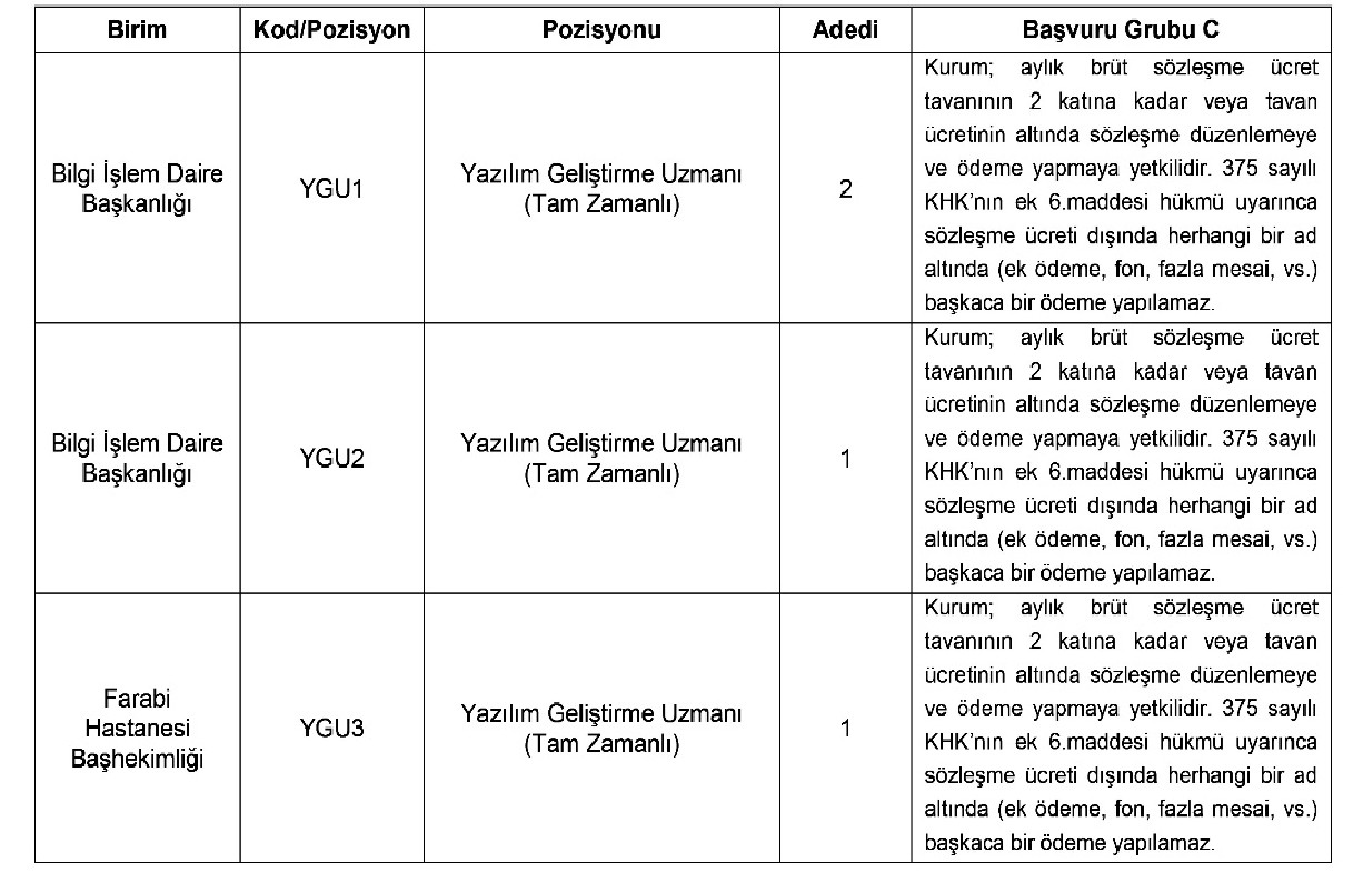 Karadeniz Teknik Üniversitesi, Bilgi işlem Dairesi Başkanlığı ve Farabi Hastanesi Başhekimliği bünyesinde istihdam edilmek üzere 375 sayılı Kanun Hükmünde Karamame'nin ek 6 ncı maddesi ile 31.12.2008 tarih ve 27097 sayılı Resmi Gazete 'de yayımlanan Kamu Kurum ve Kuruluşlarının Büyük Ölçekli Bilgi İşlem Birimlerinde Sözleşmeli Bilişim Personeli İstihdamına İlişkin Esas ve Usuller Hakkında Yönetmeliğin 8 inci maddesi uyarınca, her bir pozisyon için ayrı ayrı yapılan başvuruların kendi içinde değerlendirilmesi sonucunda genel ve özel şartlan sağlayan adaylardan, 2024 veya 2025 KPSS sınavına ait KPSSP3 puanının yüzde yetmişi (KPSS puanı olmayan veya belge ibraz etmeyen adayın KPSSP3 puanı 70 olarak dikkate alınır) ile yabancı dil puanının yüzde otuzunun (Yabancı dil puanına ilişkin belge ibraz etmeyenlerin puanı sıfır olarak değerlendirilecektir) toplamı esas alınarak yapılacak sıralamaya göre en yüksek puanlıdan başlanarak alt ilanda istihdam edileceği belirtilen personel sayısının 10 (on) katına kadar aday sözlü sınava çağırılarak gerçekleştirilecek sözlü sınav başarı sırasına göre yapılacak yerleştirme ile 3 (üç) adet Bilgi İşlem Daire Başkanlığı, 1 (bir) adet Farabi Hastanesi Başhekimliği emrinde çalıştırılmak üzere Sözleşmeli Bilişim Personeli alınacaktır. Başvuruda bulunan adaylardan şartları uygun olanlar sözlü sınava davet edilecektir. Müracaatlar 28.11.2025-12.12.2025 tarihleri arasında yapılacaktır.