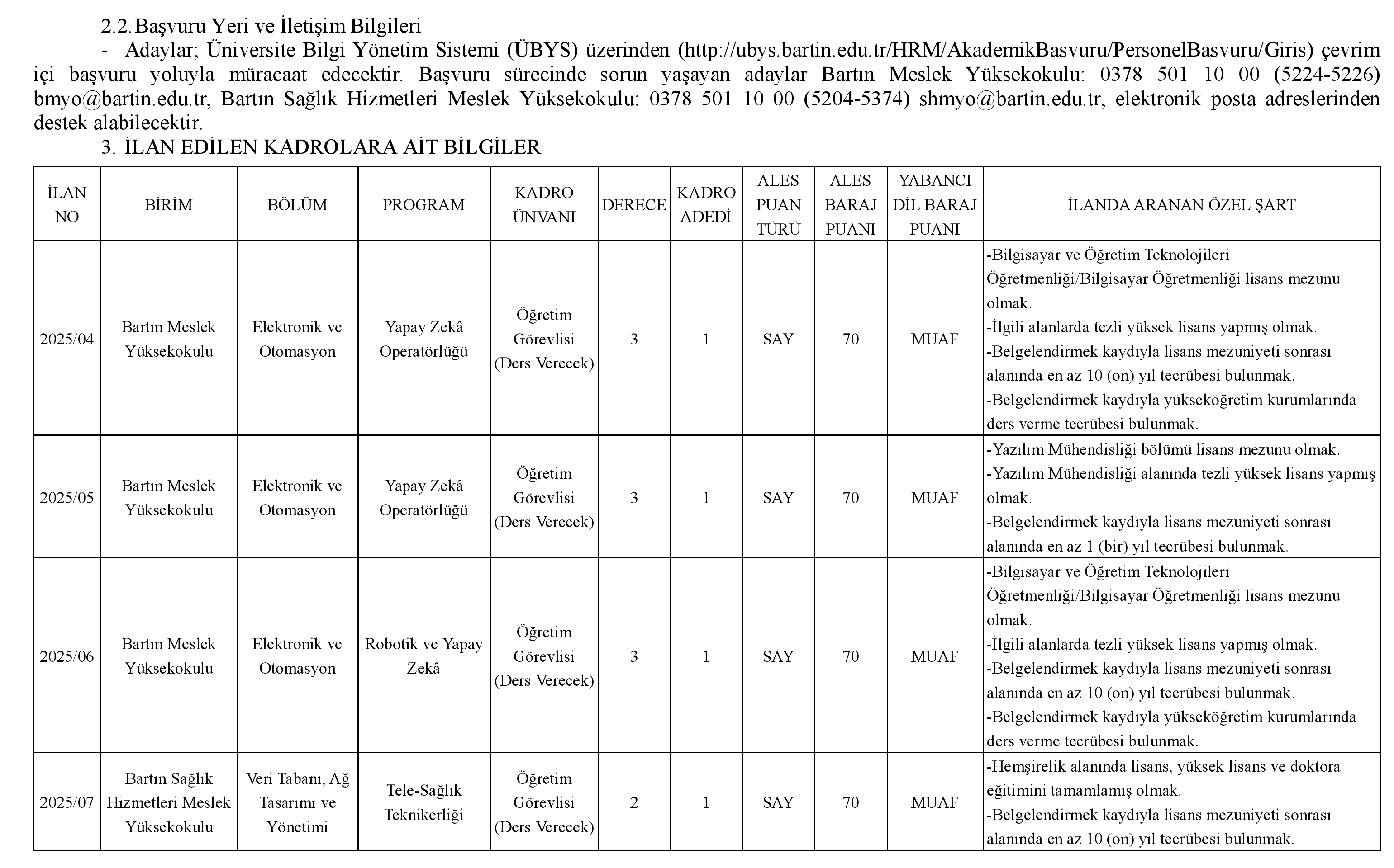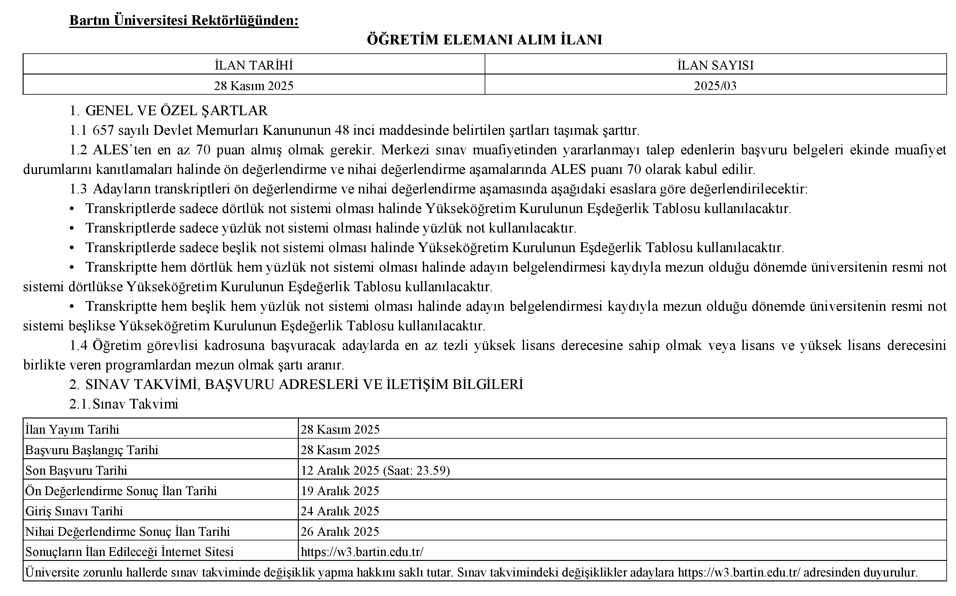 Bartın Üniversitesi Öğretim Elemanı Alım İlanı. Son başvuru tarihi 12 Aralık 2025