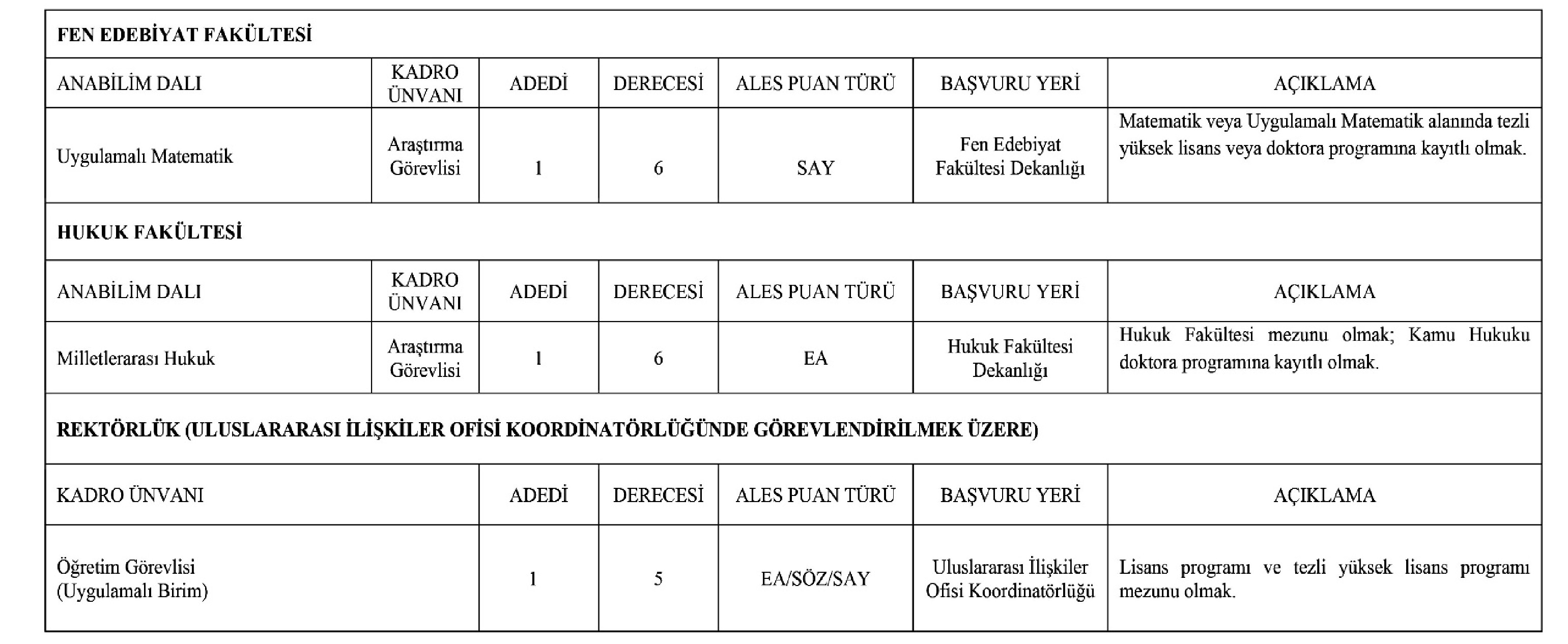Üniversitemizin aşağıda belirtilen birimlerine, 10.07.2018 tarihli Resmi Gazete'de yayımlanan Genel Kadro ve Usulü Hakkında 2 sayılı Cumhurbaşkanlığı Kararnamesi, 2547 sayılı Yükseköğretim Kanunu'nun ilgili maddeleri ve 09.11.2018 tarihli ve 30590 sayılı Resmi Gazete'de yayımlanarak yürürlüğe giren "Öğretim Üyesi Dışındaki Öğretim Elemanı Kadrolarına Yapılacak Atamalarda Uygulanacak Merkezi Sınav ile Giriş Sınavlarına ilişkin Usul ve Esaslar Hakkında Yönetmeliksin ilgili maddelerine göre Araştırma Görevlisi ve Öğretim Görevlisi (Uygulamalı Birim) alınacaktır.