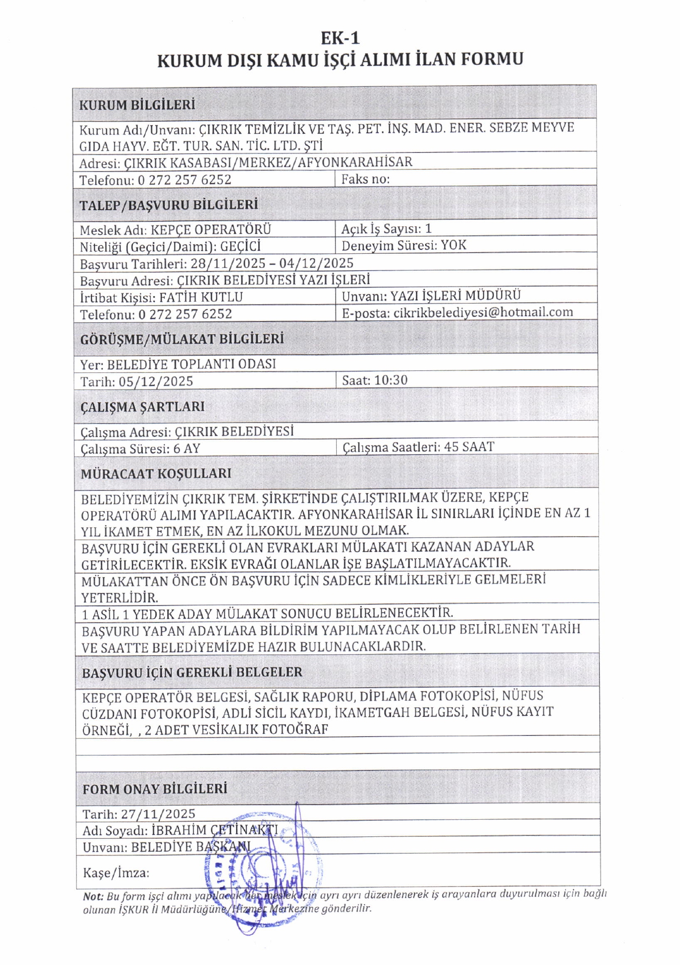 Ana sayfaGeçici İşçi İlanları Afyonkarahisar Çıkrık Temizlik Geçici 1 İşçi Alacak Afyonkarahisar Çıkrık Temizlik Geçici 1 İşçi Alacak. Son başvuru tarihi 4 Aralık 2025 Kaynak : İşkur İlan Giriş : 28 Kasım 2025 21:17, Son Güncelleme : 28 Kasım 2025 21:59 Yazdır Yorumlar (0) Abone Ol