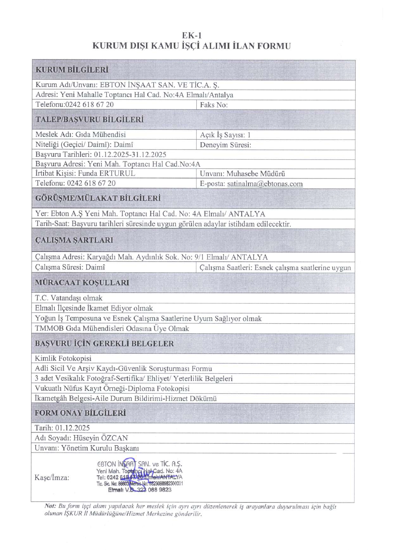 Ana sayfaDaimi İşçi İlanları Antalya Ebton İnşaat 1 İşçi Alacak Antalya Ebton İnşaat 1 İşçi Alacak. Son başvuru tarihi 31 Aralık 2025 Kaynak : İşkur İlan Giriş : 28 Kasım 2025 21:23, Son Güncelleme : 28 Kasım 2025 21:58 Yazdır Yorumlar (0) Abone Ol