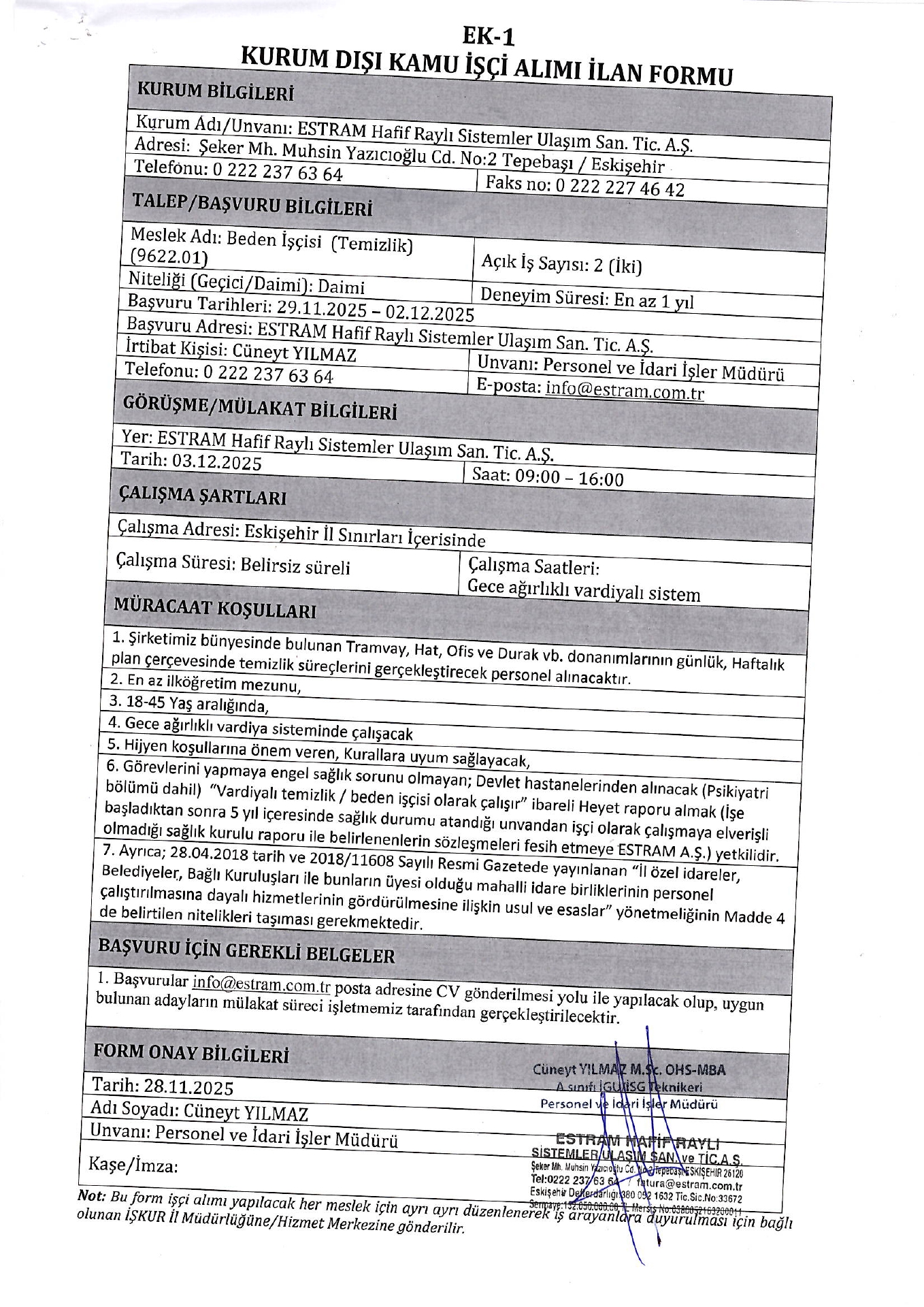 Eskişehir Estram 2 İşçi Alacak. Son başvuru tarihi 2 Aralık 2025