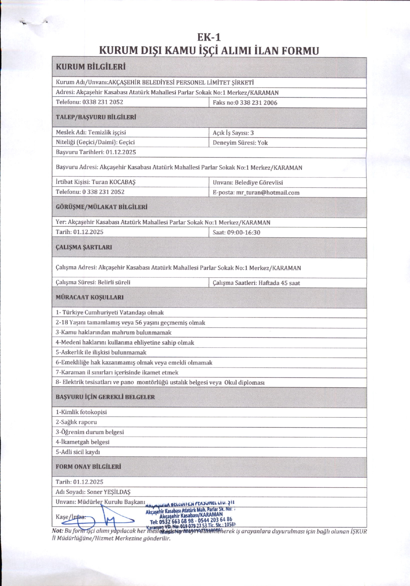 Ana sayfaGeçici İşçi İlanları Karaman Akçaşehir Belediyesi 3 İşçi Alacak Karaman Akçaşehir Belediyesi 3 İşçi Alacak. Son başvuru tarihi 1 Aralık 2025 Kaynak : İşkur İlan Giriş : 28 Kasım 2025 21:32, Son Güncelleme : 28 Kasım 2025 21:56 Yazdır Yorumlar (0) Abone Ol