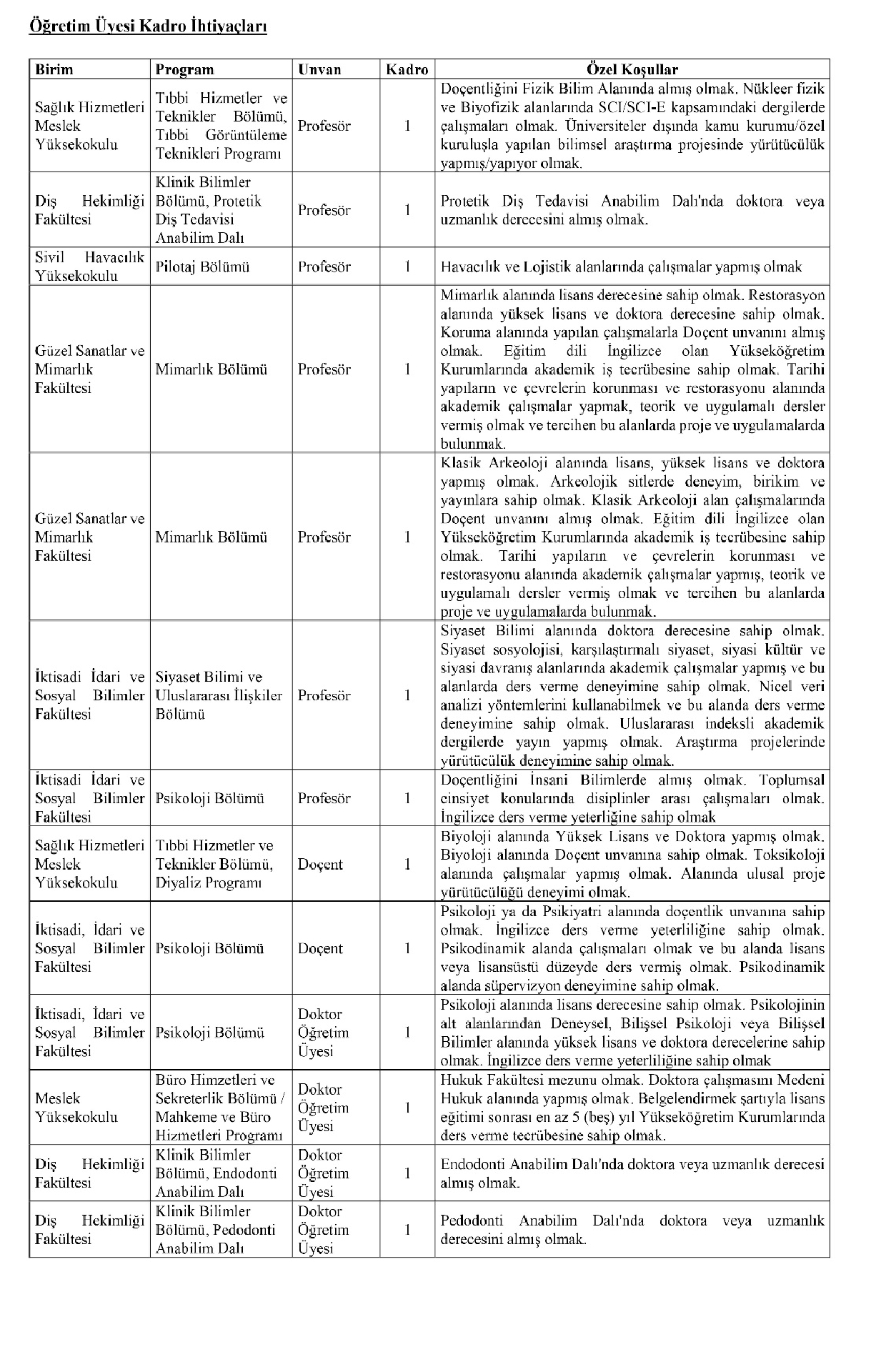 Üniversitemiz 4857 sayılı İş Kanunu hükümlerine tabi olarak. Üniversitemiz birimlerine 2547 sayılı Yükseköğretim Kanunu'nun, Öğretim Üyeliğine Yükseltilme ve Atanma Yönetmeliğinin ve Öğretim Üyesi Dışındaki Öğretim Elemanı Kadrolarına Yapılacak Atamalarda Uygulanacak Merkezi Sınav ile Giriş Sınavlarına İlişkin Usul ve Esaslar Hakkında Yönetmelik" m ilgili hükümleri gereğince, aşağıdaki tabloda belirtilen kadrolara öğretim elemanları alınacaktır.