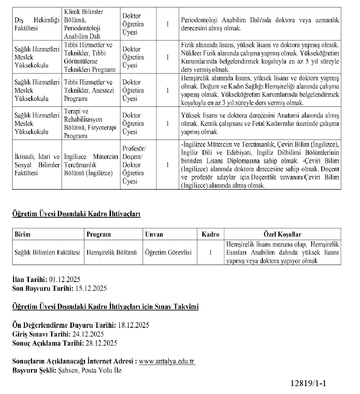Antalya Bilim Üniversitesi Öğretim Üyesi ve Elemanı Alım İlanı. Son başvuru tarihi 15 Aralık 2025