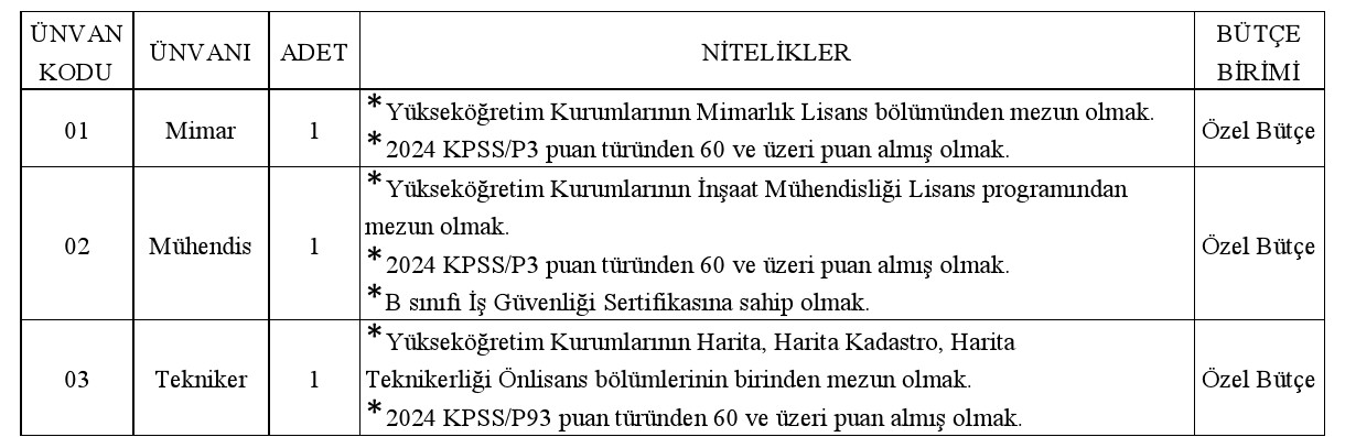 Üniversitemiz birimlerinde (Rektörlük, Fakülteler, Yüksekokullar, Enstitüler, Hastane, Merkez Müdürlükleri vb.) istihdam edilmek üzere (giderleri özel bütçeden karşılanacaktır.) 657 Sayılı Devlet Memurları Kanununun 4. maddesinin (B) fıkrası ile 06.06.1978 tarihli ve 7/15754 sayılı Bakanlar Kurulu Kararı ile yürürlüğe konulan Sözleşmeli Personel Çalıştırılmasına İlişkin Esaslarda yer alan Ek 2. maddenin (b) fıkrasına göre 2024 KPSS (B) grubu puan sıralaması esas alınmak suretiyle aşağıda belirtilen pozisyonlara 3 ADET sözleşmeli personel alınacaktır.
