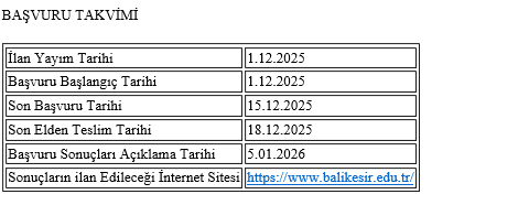 * Başvurular, e-Devlet Kapısı üzerinden "Balıkesir Üniversitesi - Kariyer Kapısı Kamu İşe alım" hizmeti aracılığıyla veya Cumhurbaşkanlığı İnsan Kaynakları Ofisi Kariyer Kapısı (https://kariyerkapisi.gov.tr/isealim) platformu üzerinden 01.12.2025 (00.01) - 15.12.2025(23.59) tarihleri arasında alınacaktır.