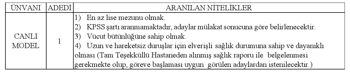 657 sayılı Devlet Memurları Kanunu'nun 4. Maddesinin B fıkrası hükmü ile Sözleşmeli personel çalıştırılmasına ilişkin 06.06.1978 tarihli ve 7/15754 sayılı Kararnameye ekli 28/06/2007 Tarihli ve 26566 sayılı Resmi Gazete'de yayımlanan Sözleşmeli Personel Çalıştırılmasına İlişkin Esaslarda Değişiklik Yapılmasına Dair Esaslarda yer alan Ek 8. Maddesi uyarınca (1 yıldan az süreli veya mevsimlik çalışma) Üniversitemiz Eğitim Fakültesi ve Güzel Sanatlar Fakültesi bünyesinde 2026 yılı içerisinde eğitim-öğretim süresi ile sınırlı olmak kaydıyla çalıştırılmak üzere giderleri özel bütçeden karşılanarak; 1 (bir) Canlı Model sözleşmeli personel alınacaktır.