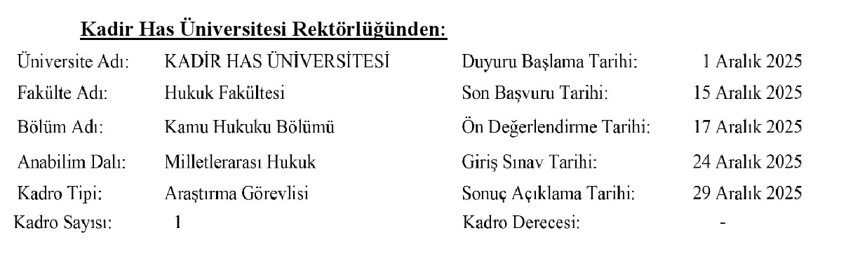 Kadir Has Üniversitesi Hukuk Fakültesi Milletlerarası Hukuk Anabilim Dalında görevlendirilmek üzere 1 (bir) Araştırma Görevlisi alınacaktır.