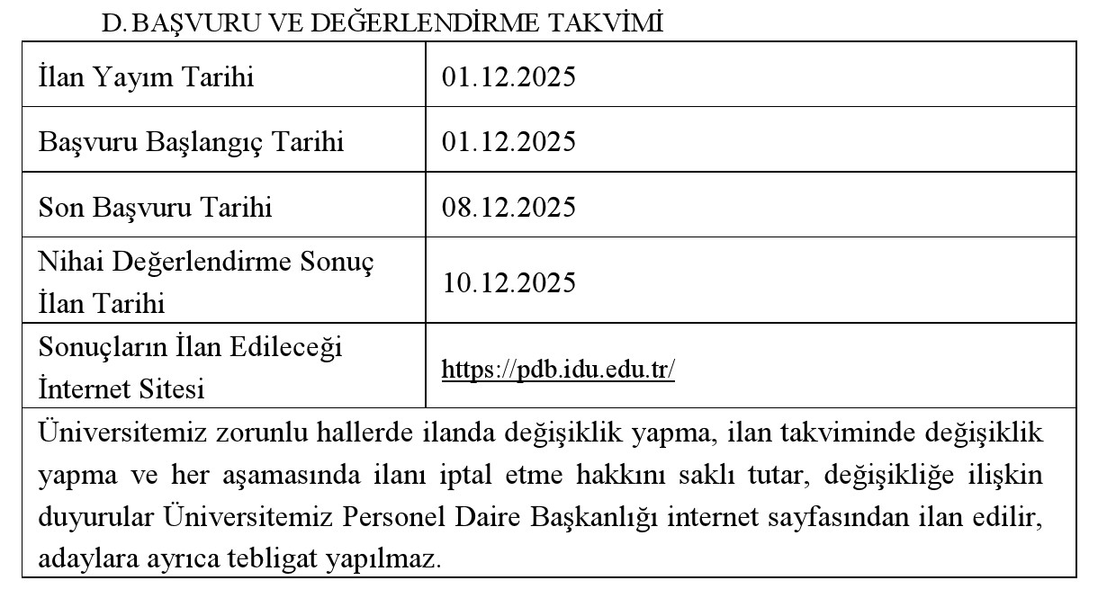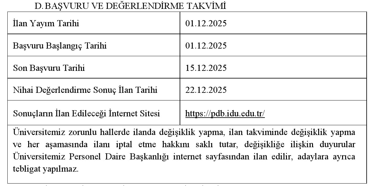 5. Adaylar, sonuç bilgilerine Kariyer Kapısı üzerinden veya www.idu.edu.tr ve https://pdb.idu.edu.tr/adreslerinden ulaşabileceklerdir.