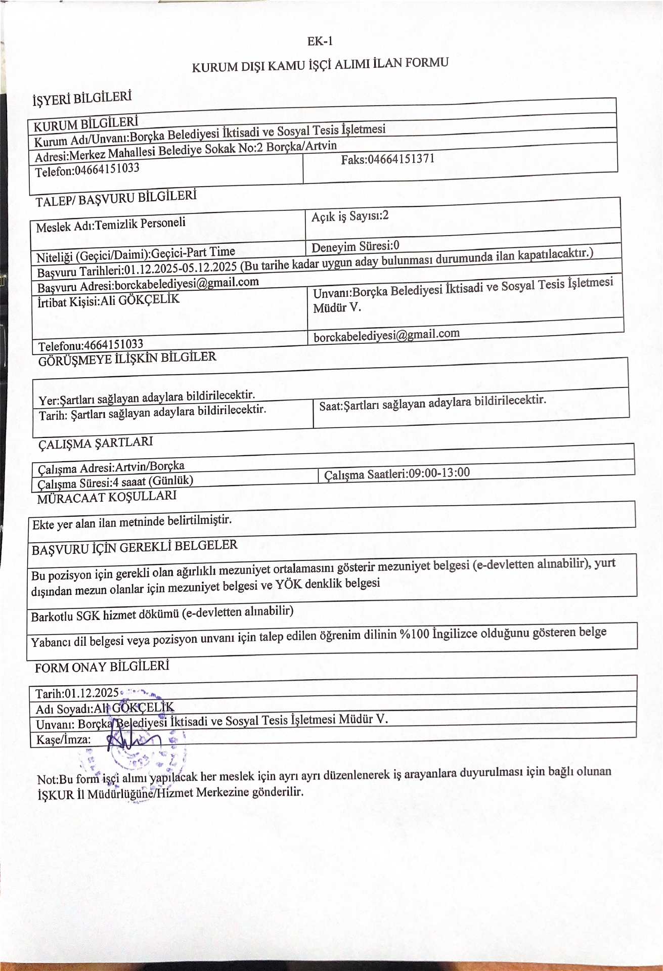 Ana sayfaGeçici İşçi İlanları Artvin Borçka Belediyesi 2 İşçi Alacak Artvin Borçka Belediyesi 2 İşçi Alacak. Son başvuru tarihi 5 Aralık 2025 Kaynak : İşkur İlan Giriş : 01 Aralık 2025 22:03, Son Güncelleme : 01 Aralık 2025 23:53 Yazdır Yorumlar (0) Abone Ol