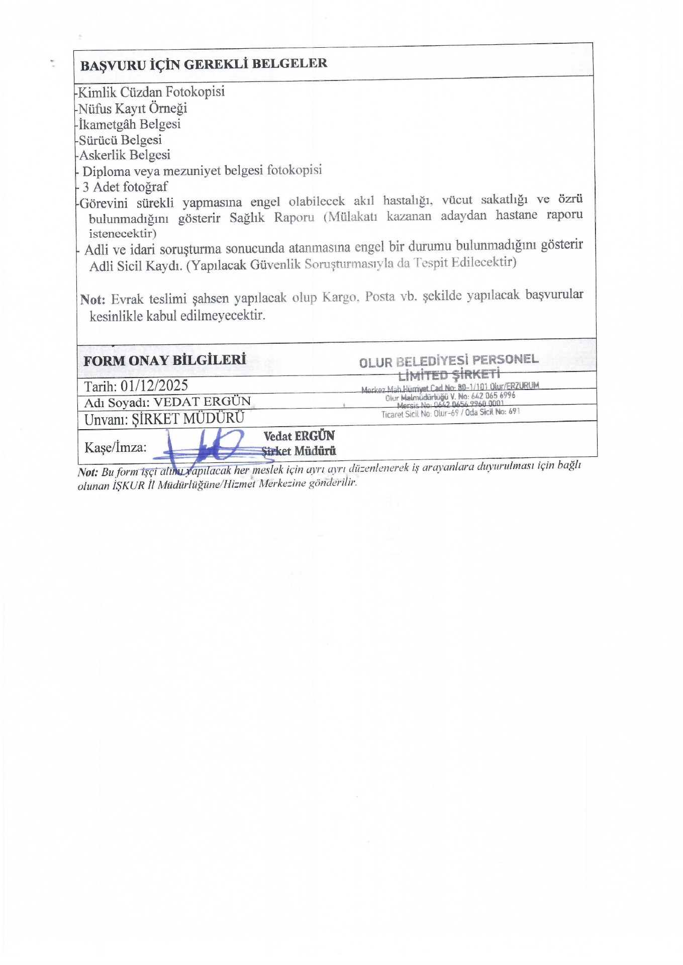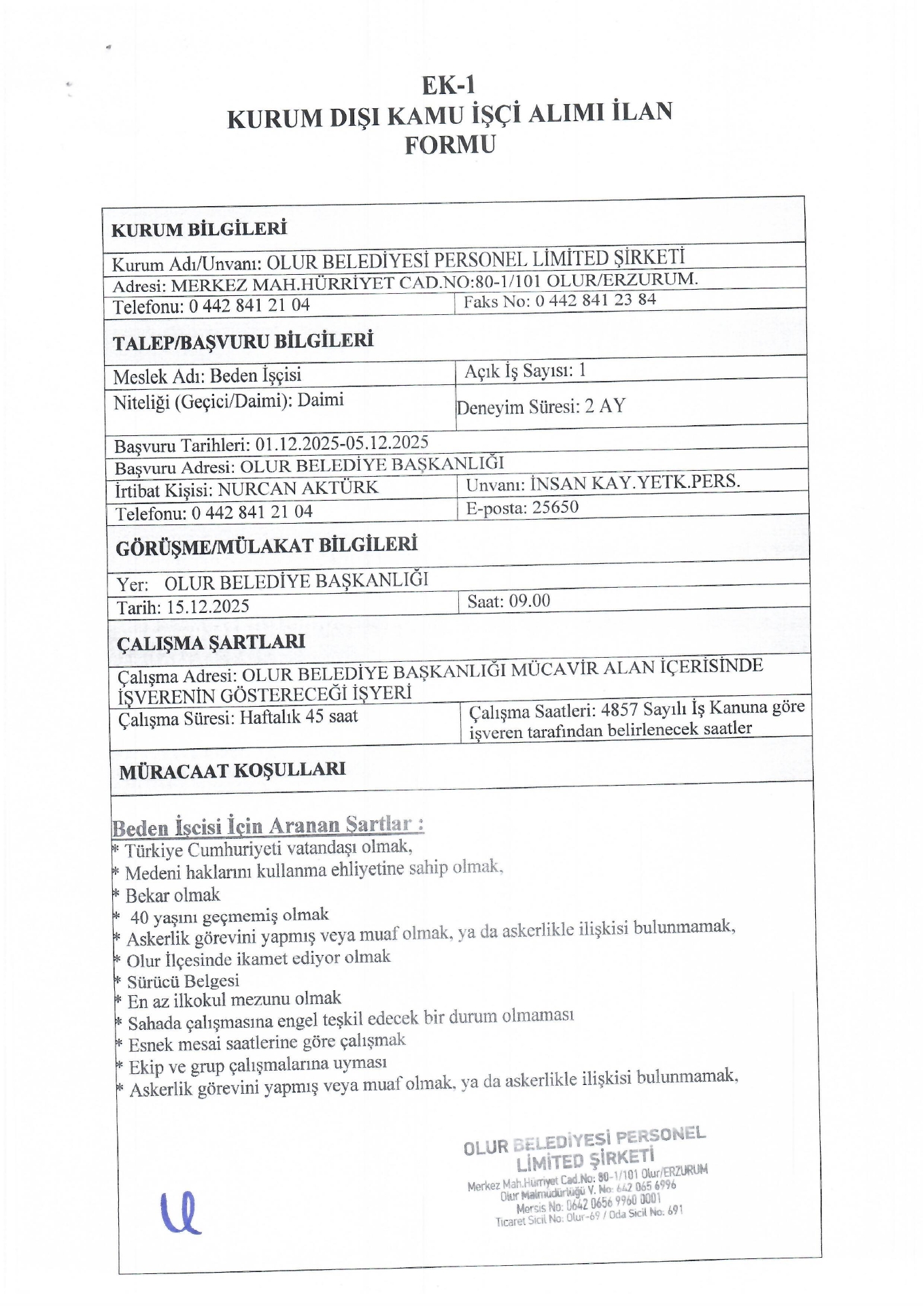 Erzurum Olur Belediyesi 1 İşçi Alacak. Son başvuru tarihi 5 Aralık 2025