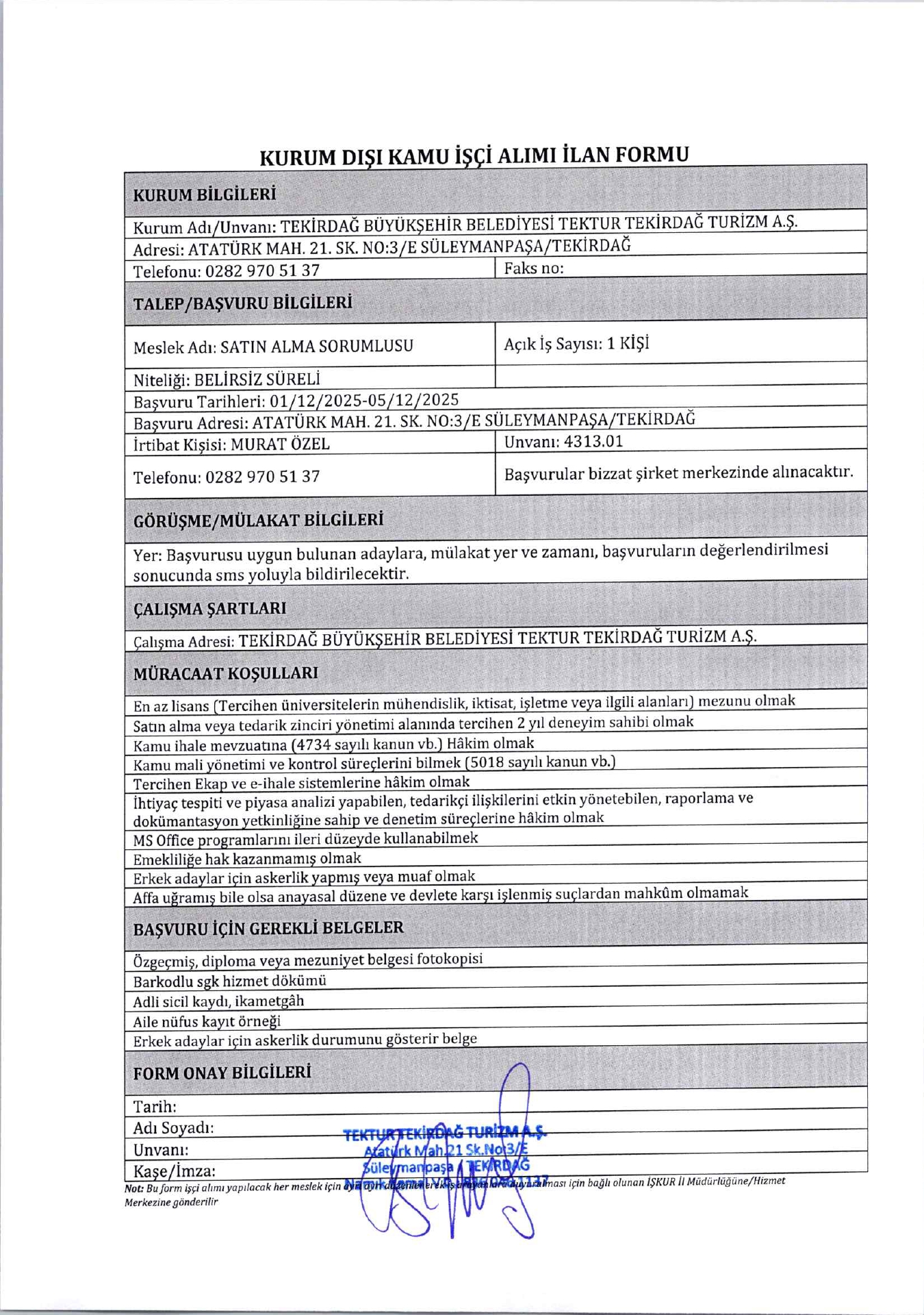 Ana sayfaDaimi İşçi İlanları Tekirdağ Tektur 1 İşçi Alacak Tekirdağ Tektur 1 İşçi Alacak. Son başvuru tarihi 5 Aralık 2025 Kaynak : İşkur İlan Giriş : 01 Aralık 2025 22:36, Son Güncelleme : 01 Aralık 2025 23:31 Yazdır Yorumlar (0) Abone Ol
