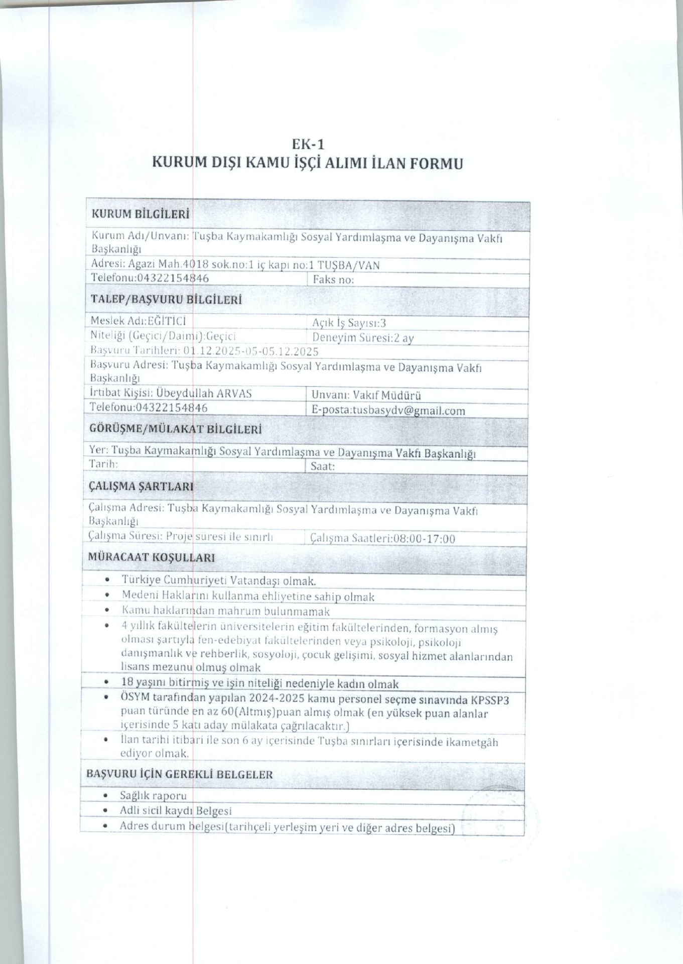 Ana sayfaSYDV İlanlarıAna sayfaGeçici İşçi İlanları Van Tuşba SYDV Geçici 3 İşçi Alacak Van Tuşba SYDV Geçici 3 İşçi Alacak. Son başvuru tarihi 5 Aralık 2025 Kaynak : İşkur İlan Giriş : 01 Aralık 2025 22:39, Son Güncelleme : 01 Aralık 2025 23:30 Yazdır Yorumlar (0) Abone Ol