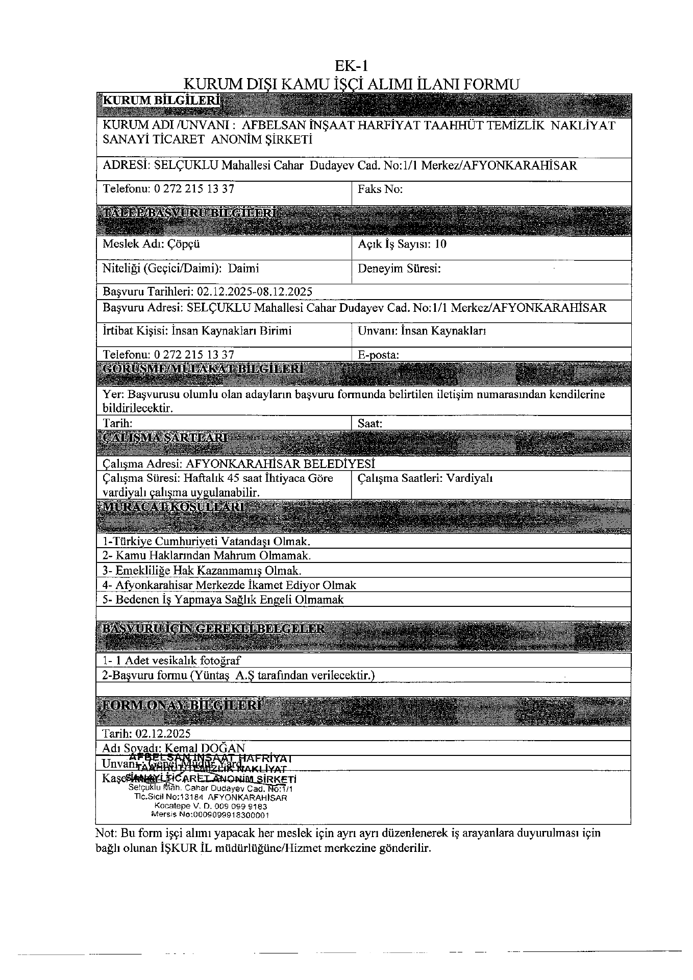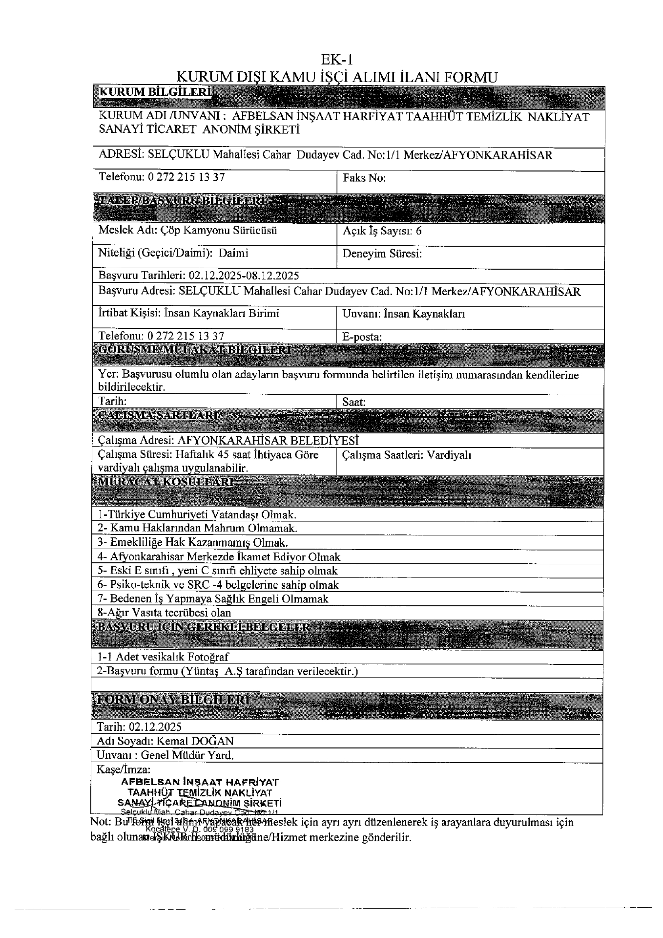 Afyonkarahisar Afbelsan 16 İşçi Alacak. Son başvuru tarihi 8 Aralık 2025