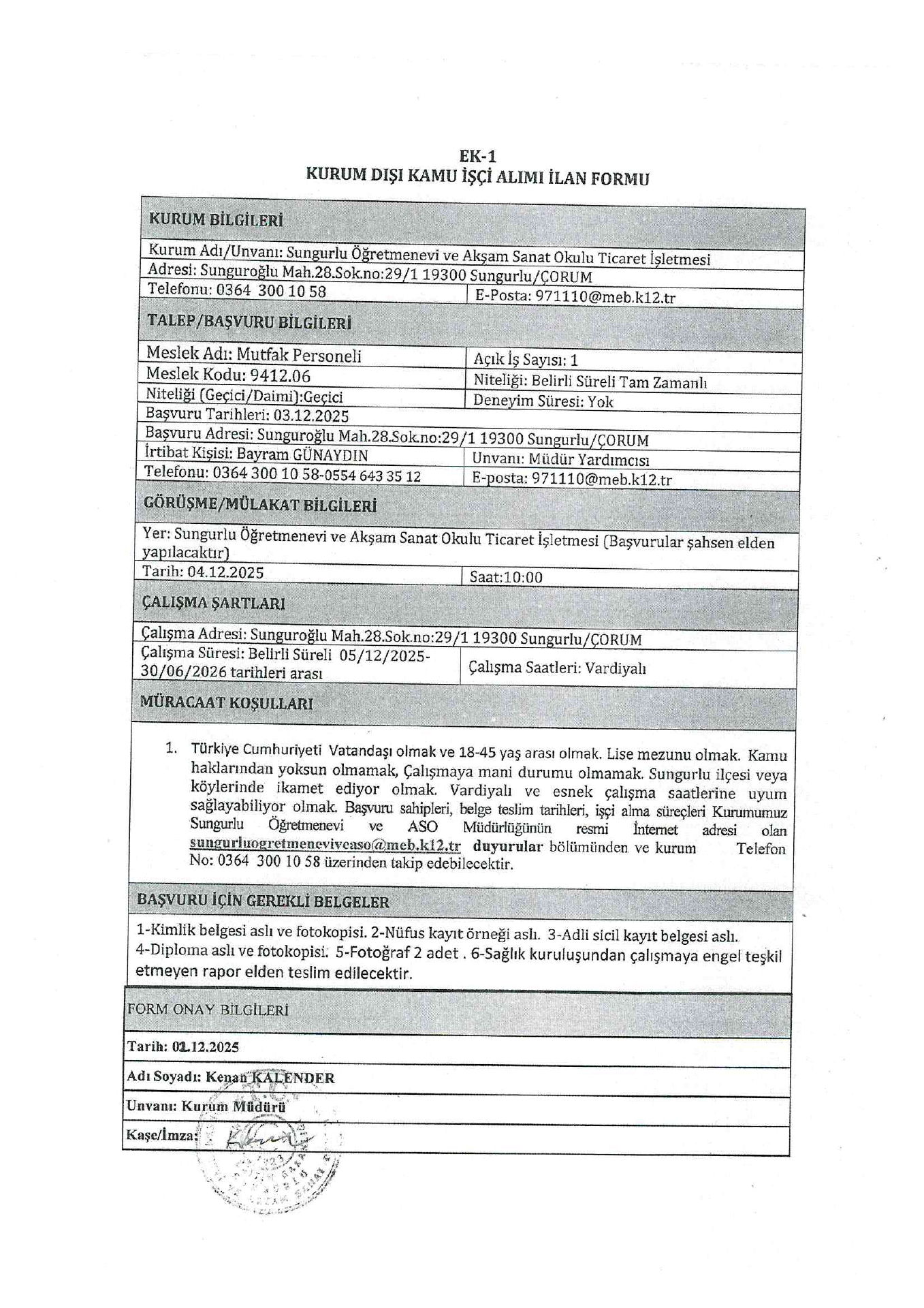 Çorum Sungurlu Öğretmenevi Geçici 1 İşçi Alacak. Son başvuru tarihi 3 Aralık 2025