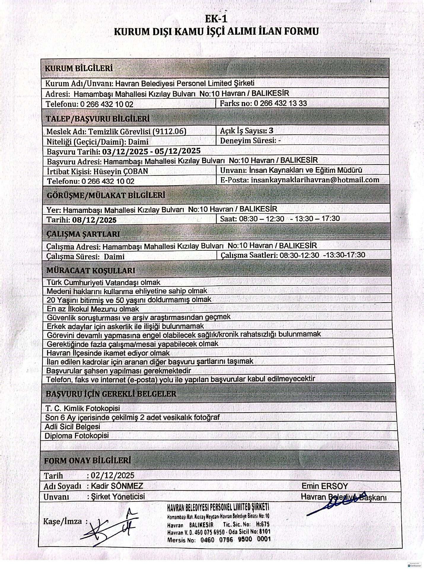 Ana sayfaDaimi İşçi İlanları Balıkesir Havran Belediyesi 3 İşçi Alacak Balıkesir Havran Belediyesi 3 İşçi Alacak. Son başvuru tarihi 5 Aralık 2025 Kaynak : İşkur İlan Giriş : 02 Aralık 2025 23:24, Son Güncelleme : 02 Aralık 2025 23:24 Yazdır Yorumlar (0) Abone Ol