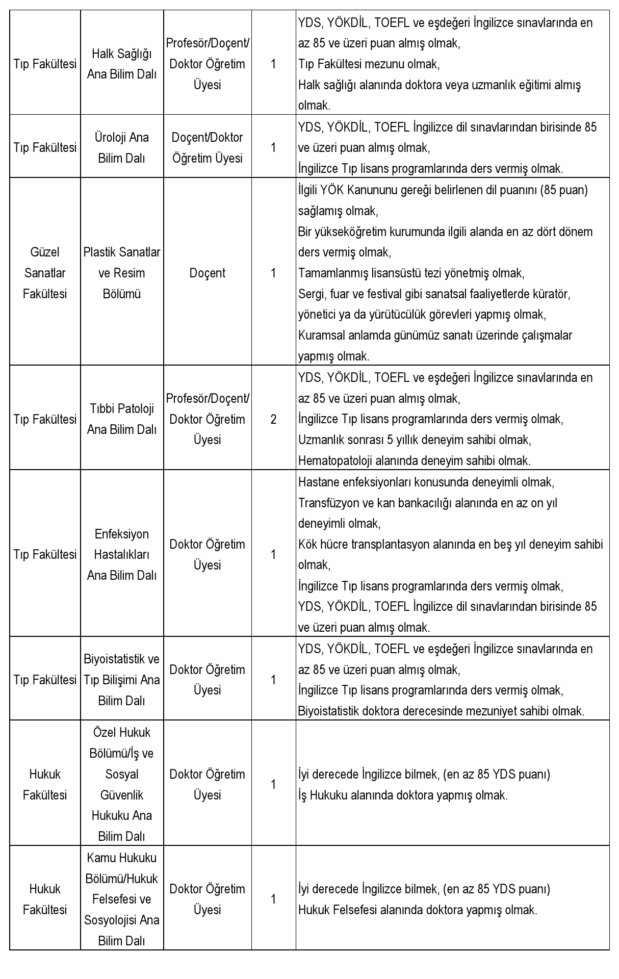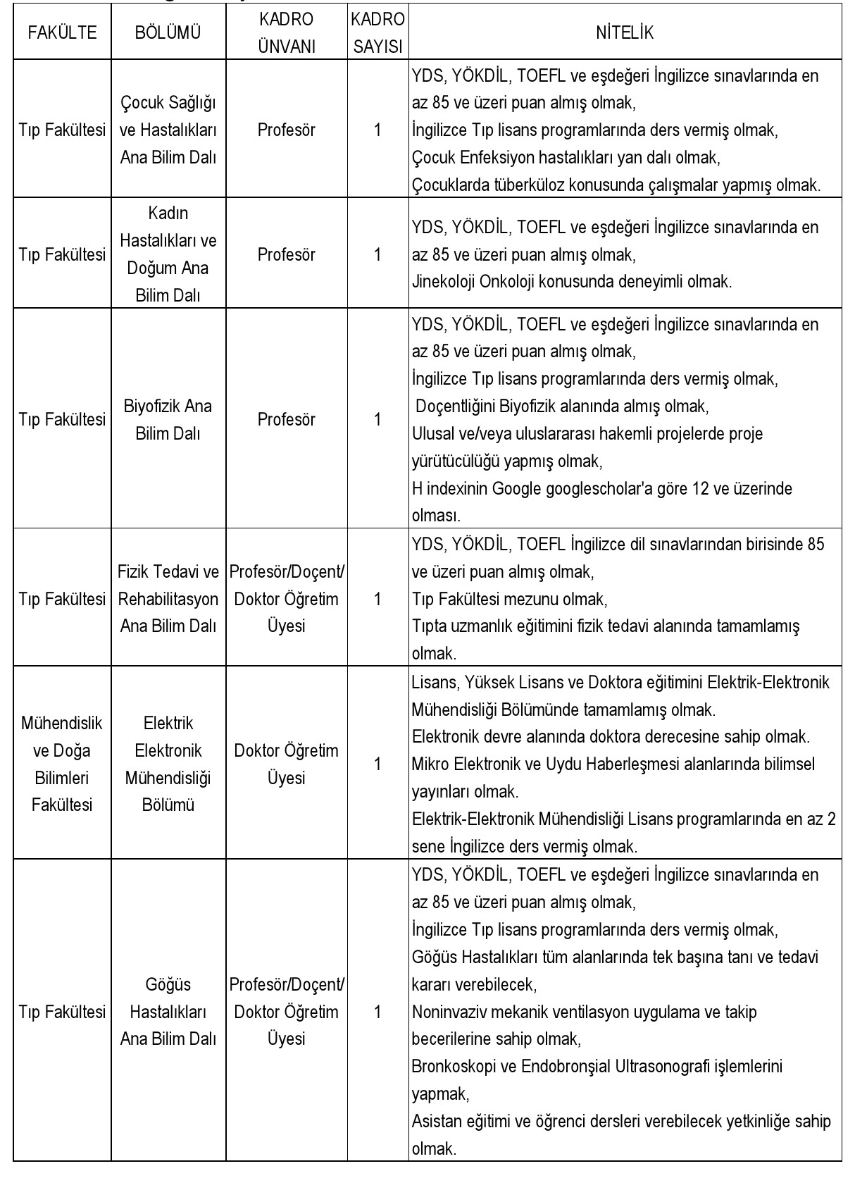 Üniversitemizin aşağıda belirtilen birimlerinde açık bulunan Profesör, Doçent ve Doktor Öğretim Üyesi kadrolarına 2547 sayılı Yükseköğretim Kanununun 26., 24. ve 23. maddesi ile Öğretim Üyeliğine Yükseltilme ve Atanma Yönetmeliğinin ilgili maddeleri hükümlerine göre tam zamanlı statüde Öğretim Üyeleri alınacaktır.